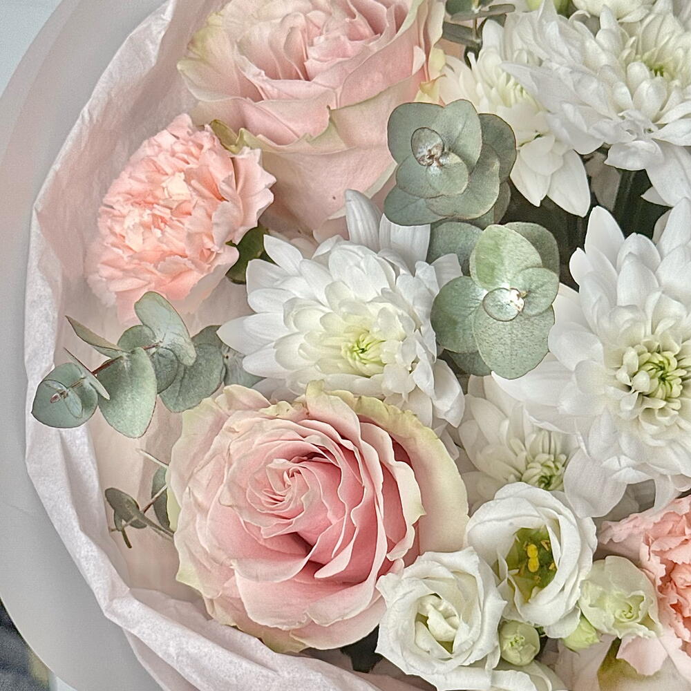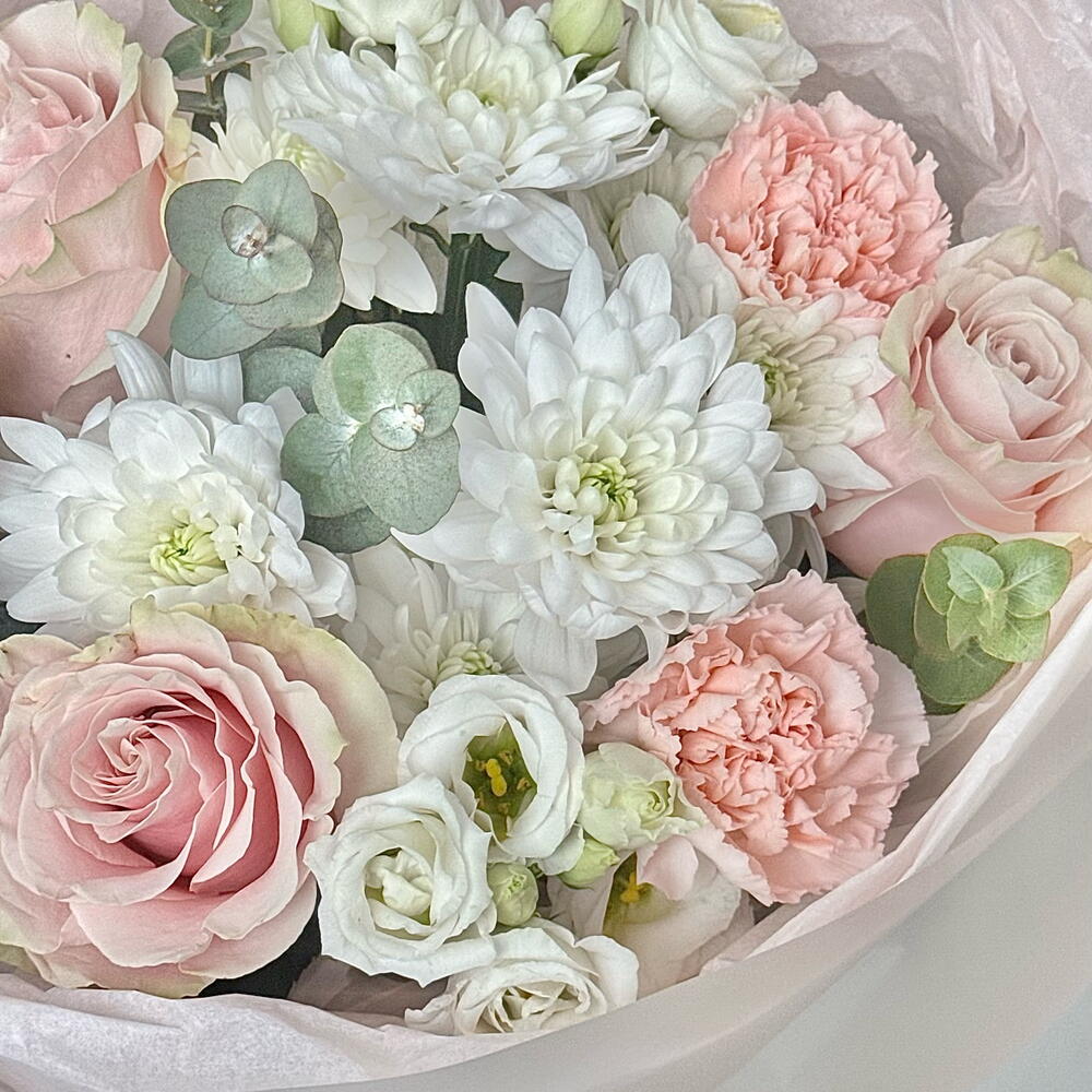 Eustoma - 2 pcs rose - 3 pcs packaging - 3 pcs dianthus - 3 pcs chrysanthemum - 1 pcs eucalyptus - 2 pcs