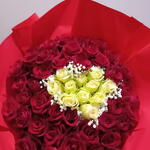 red roses - 40 pcs white baby's breath – delicate filler - 5 pcs wrapped in elegant red florist paper - 1 pcs cream roses light green (center) – - 11 pcs
