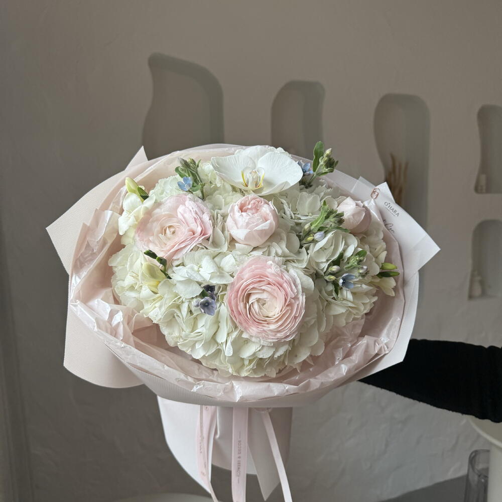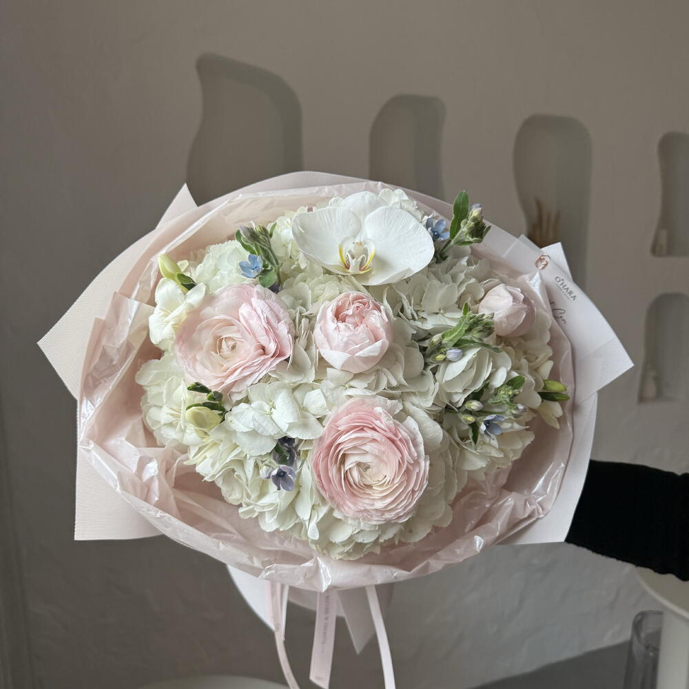 Hydrangea - 4 pcs Freesia - 3 pcs Orchid - 1 pcs Peony pink - 2 pcs ranunculus - 2 pcs oxypetalum - 5 pcs