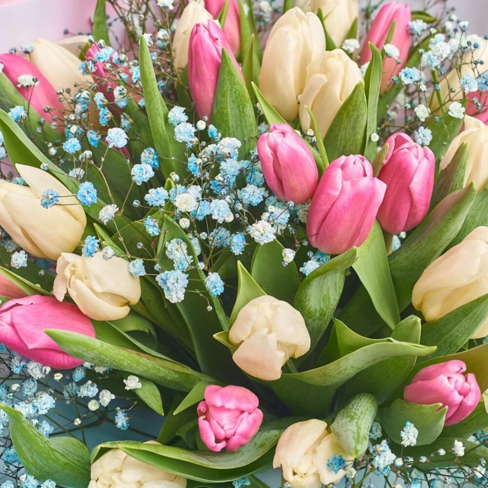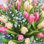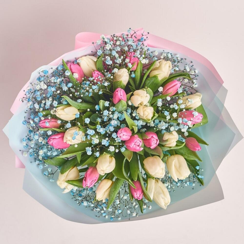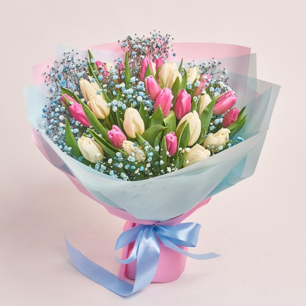 Tulips - 17 pcs gypsophila rainbow - 3 pcs designer packaging - 1 pcs