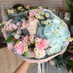 lagurus - 5 pcs anthurium - 2 pcs hydrangea - 1 pcs chamomile - 2 pcs eucalyptus - 3 pcs astromeria - 2 pcs spray rose - 1 pcs carnation - 7 pcs decorative paper - 1 pcs