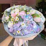 lagurus - 5 pcs anthurium - 2 pcs hydrangea - 1 pcs chamomile - 2 pcs eucalyptus - 3 pcs astromeria - 2 pcs spray rose - 1 pcs carnation - 7 pcs decorative paper - 1 pcs