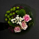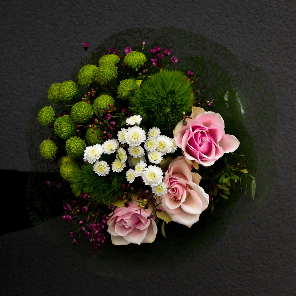 rose - 3 pcs carnation - 2 pcs wrapping paper - 2 pcs chamelaucium - 3 pcs chrysanthemum feeling green - 3 pcs spray chrysanthemum stallion - 1 pcs