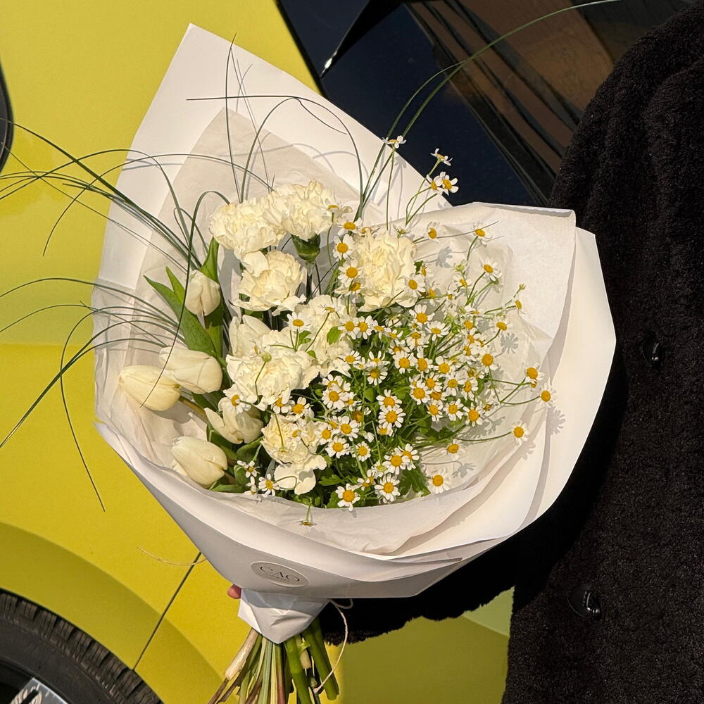 Tulip - 7 pcs carnation - 7 pcs camomile - 4 pcs bergrass - 1 pcs