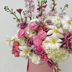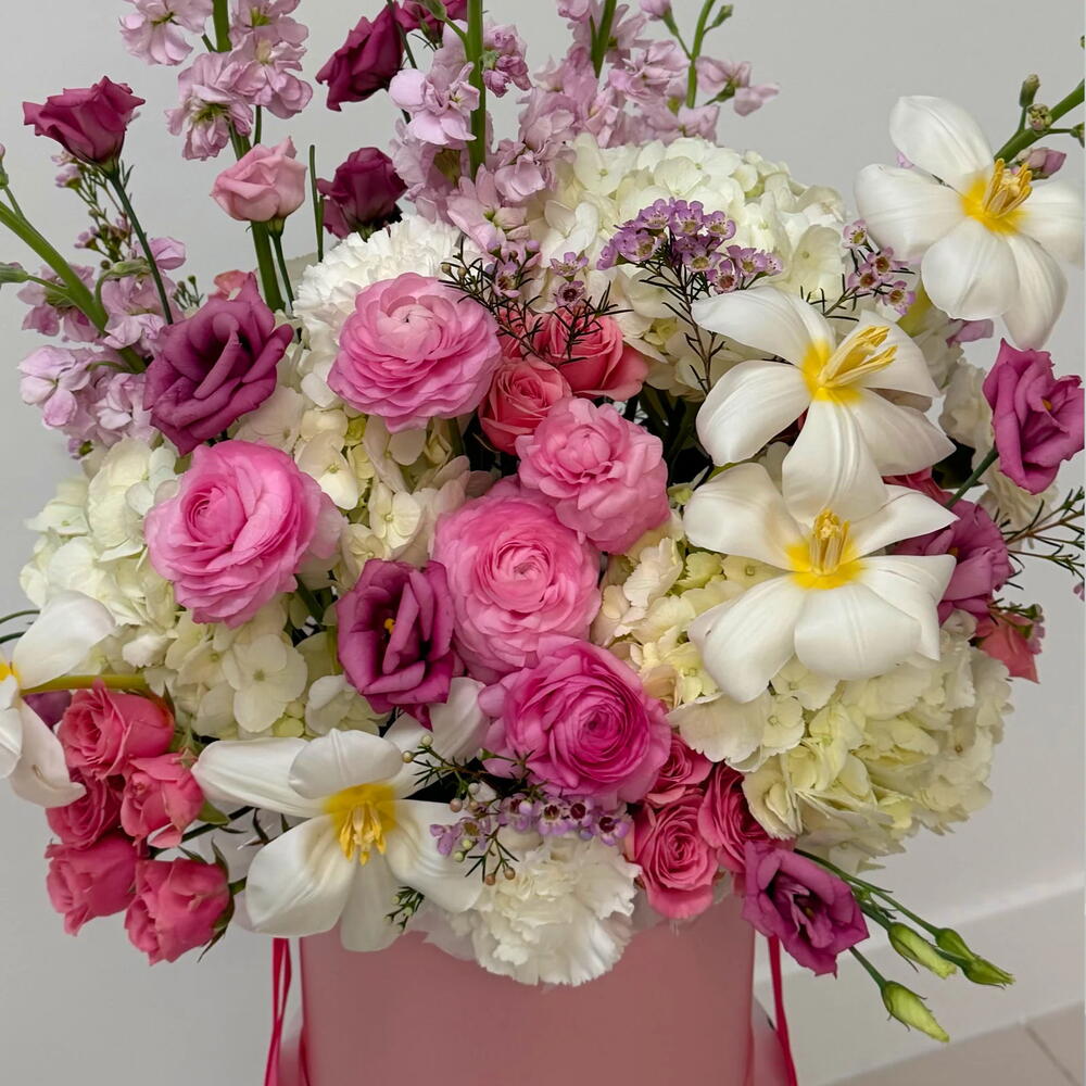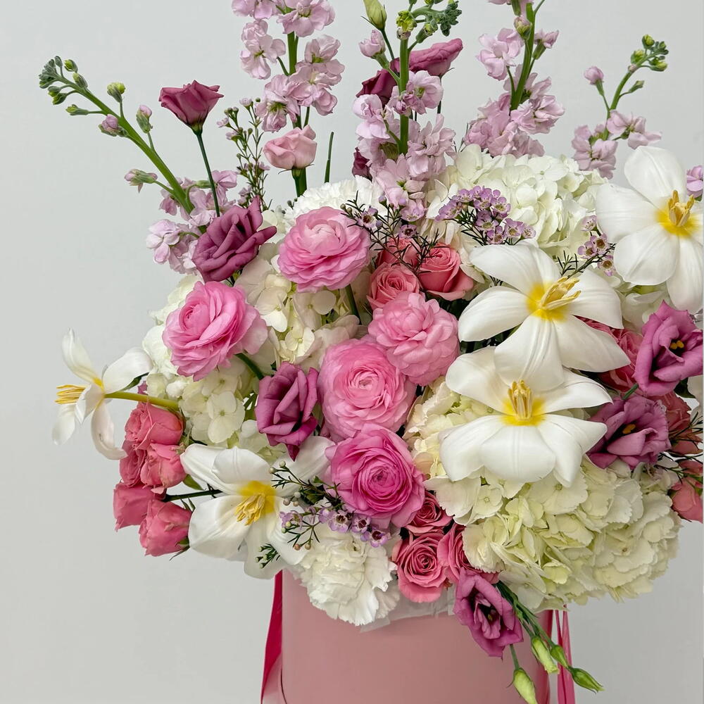 Celebrate the season with our Spring Mood Box, a vibrant arrangement bursting with the freshest blooms of the moment. This carefully curated collection features elegant tulips, delicate ranunculus, lush hydrangea, romantic lisianthus, charming spray roses, and fragrant stock. Each stem is hand-selected to bring color, texture, and natural beauty into your home. Perfect for brightening any space or sharing joy with someone special. Enjoy the essence of spring delivered fresh to your door. The actual bouquet may slightly vary from the photo. Colors, shades, and the natural shape of the flowers can differ, but the style and quality always stay the same.
