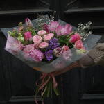 Eustoma - 1 pcs Greenery - 1 pcs Alstroemeria - 1 pcs Freesia - 1 pcs Decoration - 1 pcs Hyacinth - 2 pcs genista - 2 pcs tulips mix - 5 pcs mini roses - 3 pcs