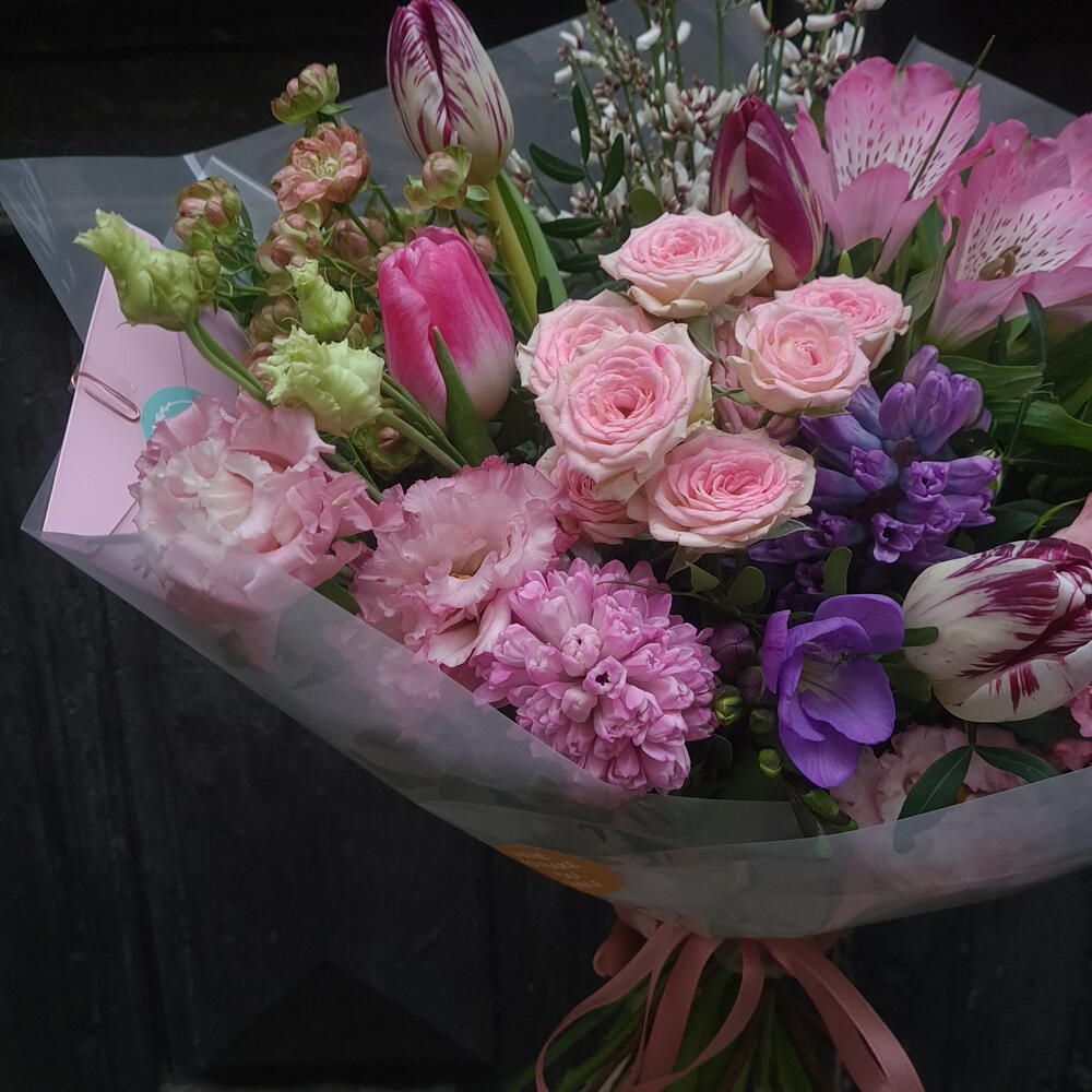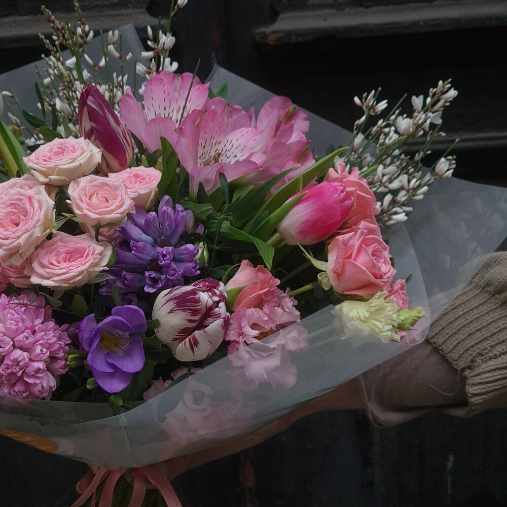 Eustoma - 1 pcs Greenery - 1 pcs Alstroemeria - 1 pcs Freesia - 1 pcs Decoration - 1 pcs Hyacinth - 2 pcs genista - 2 pcs tulips mix - 5 pcs mini roses - 3 pcs