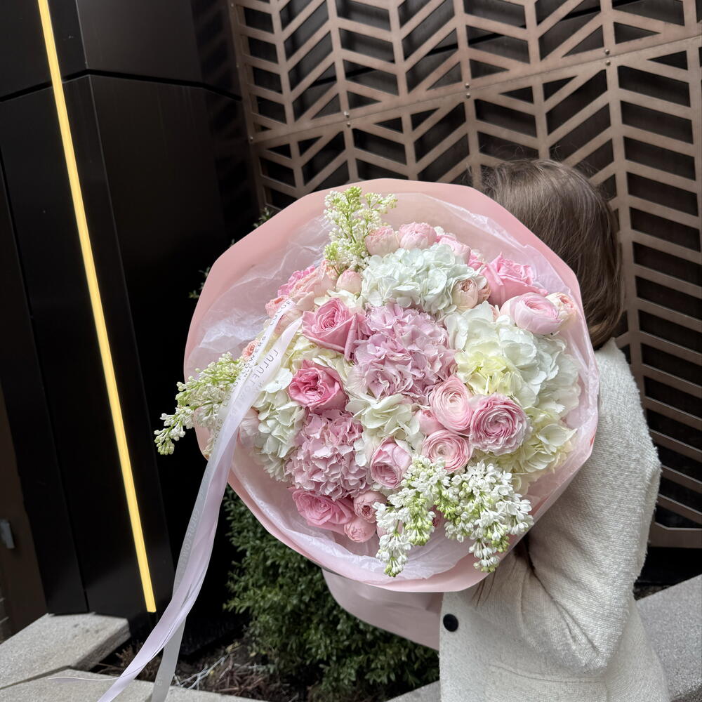 ranunculus - 3 pcs lilac white - 3 pcs hyndrangea - 6 pcs roses - 15 pcs
