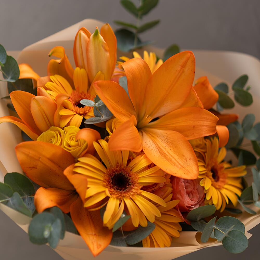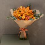 Let the magic of Autumn color the dull reality from the palette of nature, invite love and become a child again. Lilies, roses, chrysanthemums, mini roses, gerberas and decorative greens. Wrapped with craft paper. Important: The types of flowers offered may differ depending on the season.