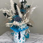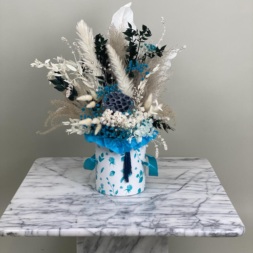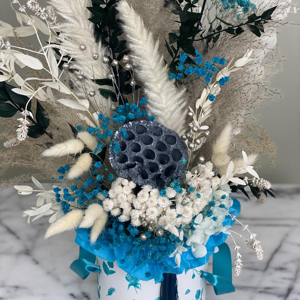 Stilvolles Trockenblumen-Arrangement in Blau-Weib