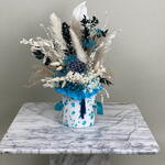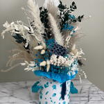 Dieses exklusive Arrangement verbindet natürliche Eleganz mit modernen Akzenten. Zarte Pampasgräser, gefärbte Schleierkrautblüten in kräftigem Blau, weiße Trockenblumen, grüne Blätter und dekorative Elemente wie die dunkle Lotusfrucht schaffen zusammen ein harmonisches, frisches Gesamtbild. Präsentiert wird die Komposition in einer liebevoll gestalteten Geschenkbox mit floralen Mustern und Satinschleifen. 🌾 Besondere Merkmale: • Hochwertige, handgefertigte Trockenblumen • Farben: Weiß, Türkisblau, Grün, Grau – für moderne, maritime Akzente • Stilvolle Geschenkbox mit Blumenmuster inklusive • Pflegeleicht langlebig – ideal für jedes Ambiente • Perfekt als Geschenk, Tisch- oder Bürodekoration