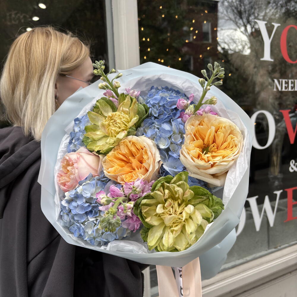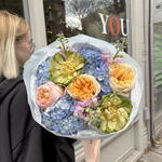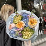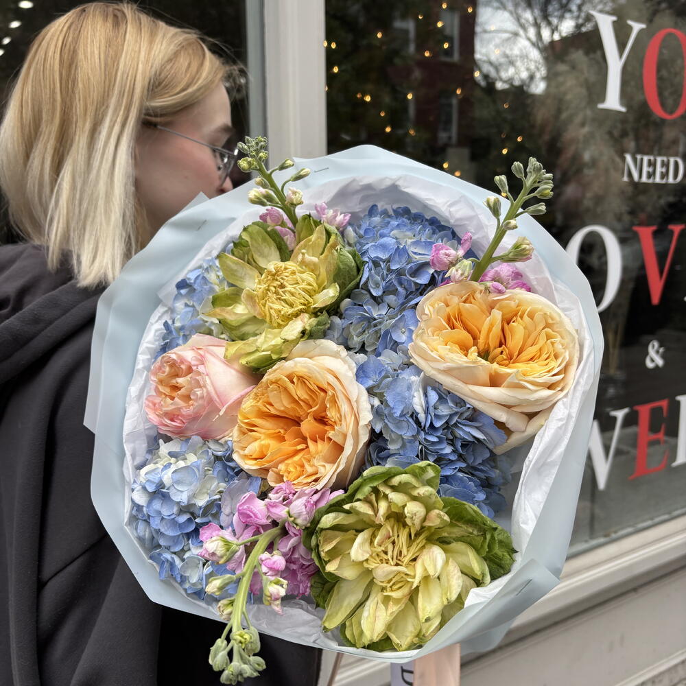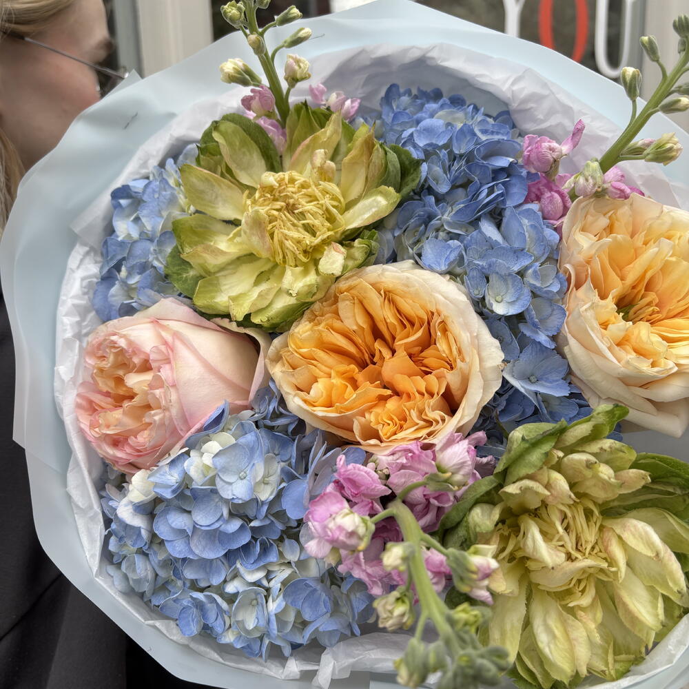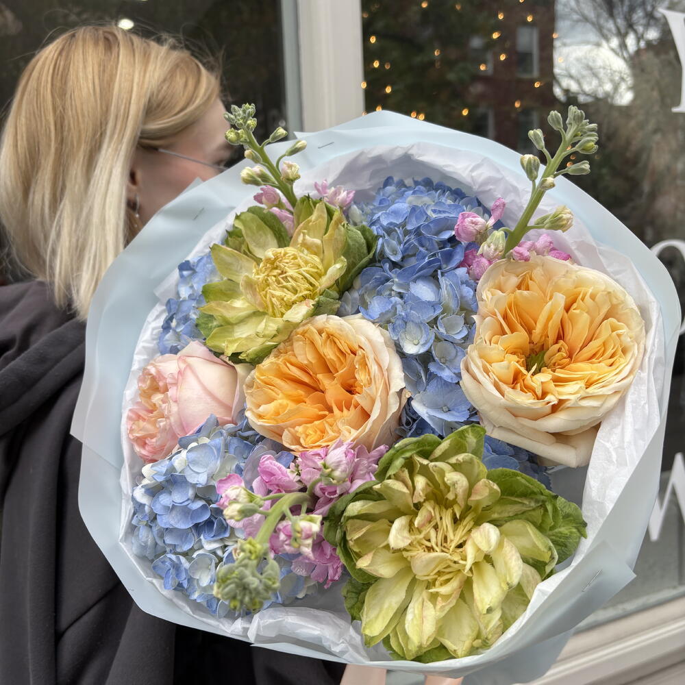 This bouquet is a lush and romantic arrangement bursting with soft, pastel tones. It features large, ruffled garden roses in shades of peach, blush, and apricot, paired with delicate green blooms and clusters of airy blue hydrangeas. Sprigs of small pink flowers add a whimsical touch and bring gentle contrast to the palette. Wrapped in layers of crisp white and light pink paper, the bouquet feels both elegant and fresh—perfect for a joyful celebration, a romantic gesture, or simply to brighten someone’s day.