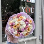 Букет красивый получился. Доставили немного позже назначенного времени, не критично для нас это было. Фото отчет сделали быстро. Доставка считаю дорогая, плюс большие розы не первой свежести были.