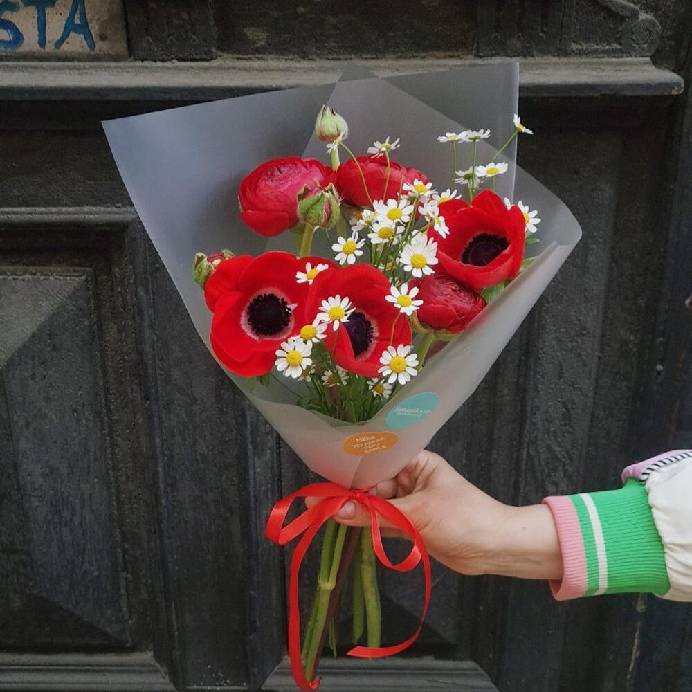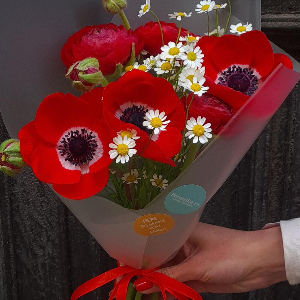 Perfect combination of red ranunculuses and anemones paired with chammomile. Great gift for any occasion!