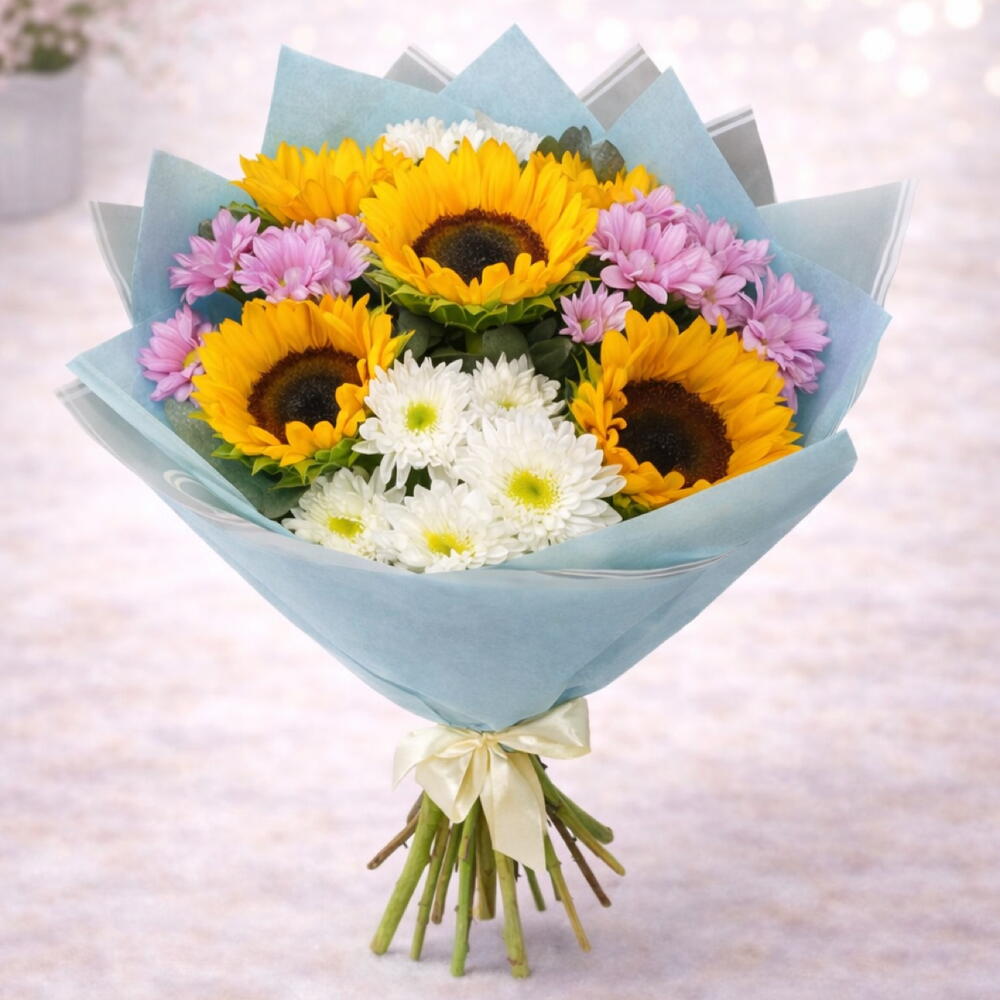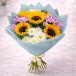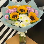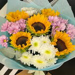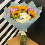 Ribbon - 1 pcs Eucalyptus - 1 pcs Chrysanthemum - 4 pcs Sunflower - 5 pcs paper - 4 pcs