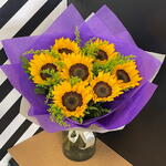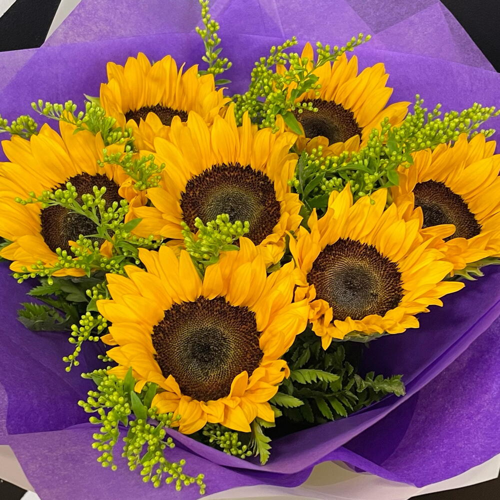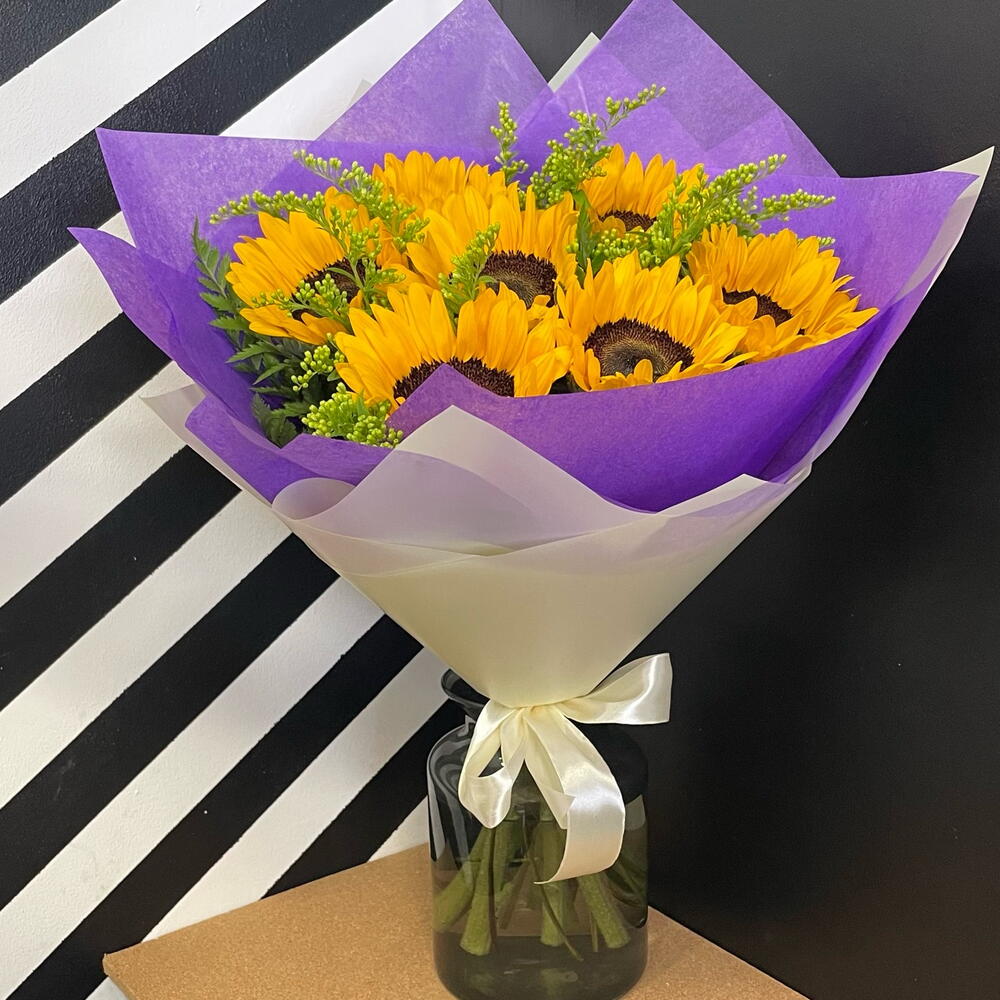 Ribbon - 1 pcs Eucalyptus - 1 pcs Solidago - 3 pcs Sunflower - 7 pcs paper - 4 pcs