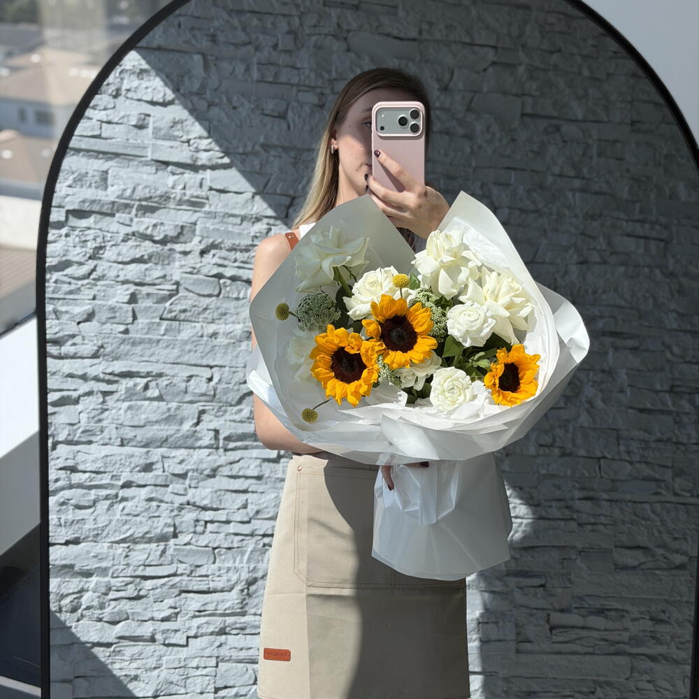 Viburnum - 3 pcs sunflowers - 3 pcs ranunculus - 3 pcs craspedia - 3 pcs french roses - 5 pcs