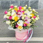 Статике - 5 pcs Tulips - 10 pcs hypericum - 5 pcs orchids - 5 pcs eucalyptus - 5 pcs roses - 7 pcs spray roses - 7 pcs roses yellow - 5 pcs