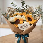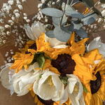 A variation of existing Sunshine bouquet with sunflowers, white tulips, gypsophila and eucalyptus stems.