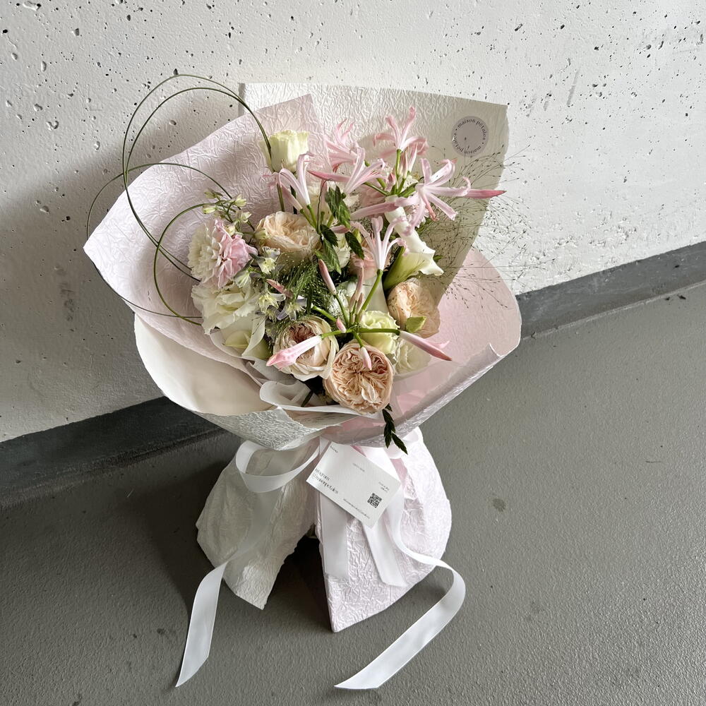 lisianthus white - 3 pcs garden rose - 5 pcs delphinium - 2 pcs calla lilies - 3 pcs panicum - 2 pcs bear grass - 3 pcs nerine pink - 3 pcs