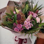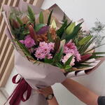 Chrysanthemum - 5 pcs carnations - 4 pcs asparagus - 2 pcs robeline - 3 pcs oriental pink lilies - 3 pcs special flower - 1 pcs