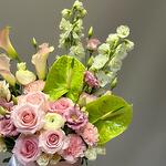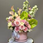 Eustoma - 2 pcs Eucalyptus - 3 pcs Anthurium - 2 pcs dianthus - 6 pcs ranunculus - 3 pcs delphinium - 2 pcs calla - 3 pcs roses - 12 pcs