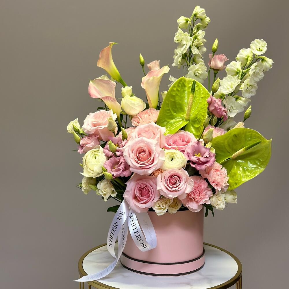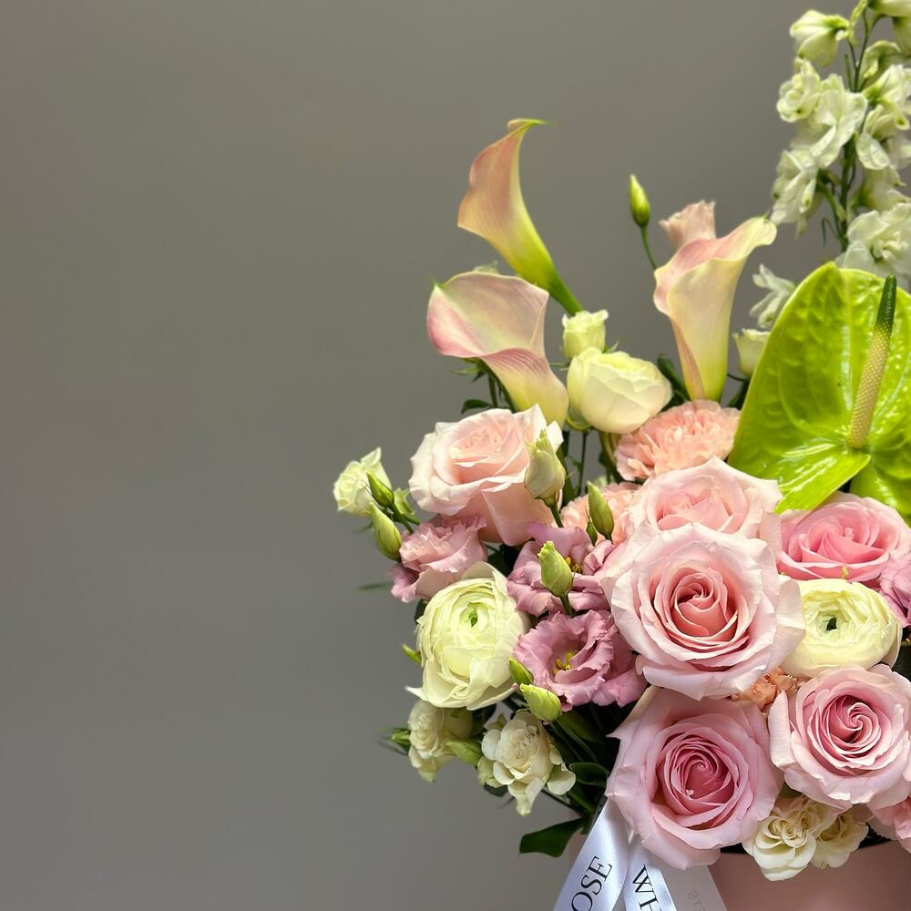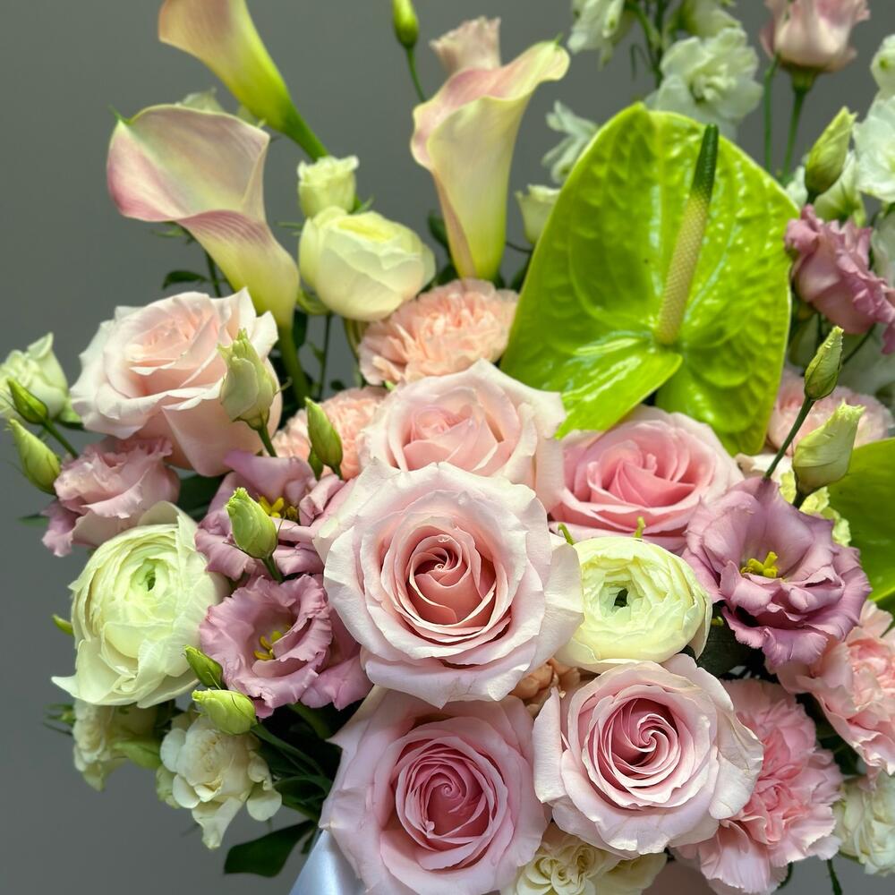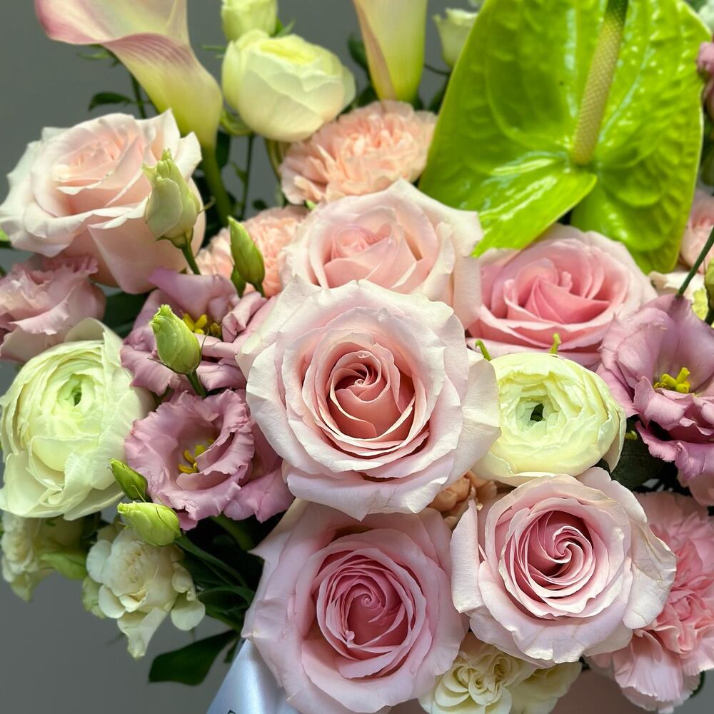 Eustoma - 2 pcs Eucalyptus - 3 pcs Anthurium - 2 pcs dianthus - 6 pcs ranunculus - 3 pcs delphinium - 2 pcs calla - 3 pcs roses - 12 pcs
