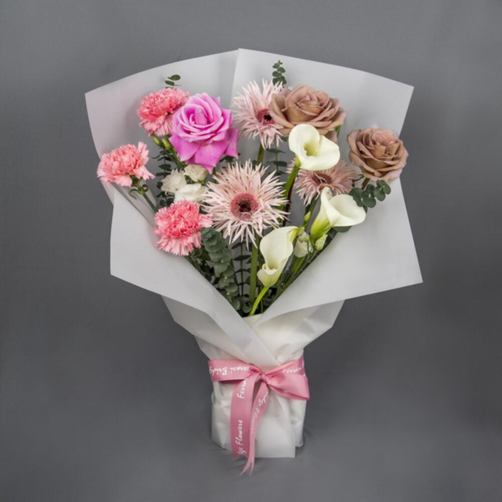A prominent mix flower arrangement with Carnation, Gerbera, Roses and Calla Lily in different color.