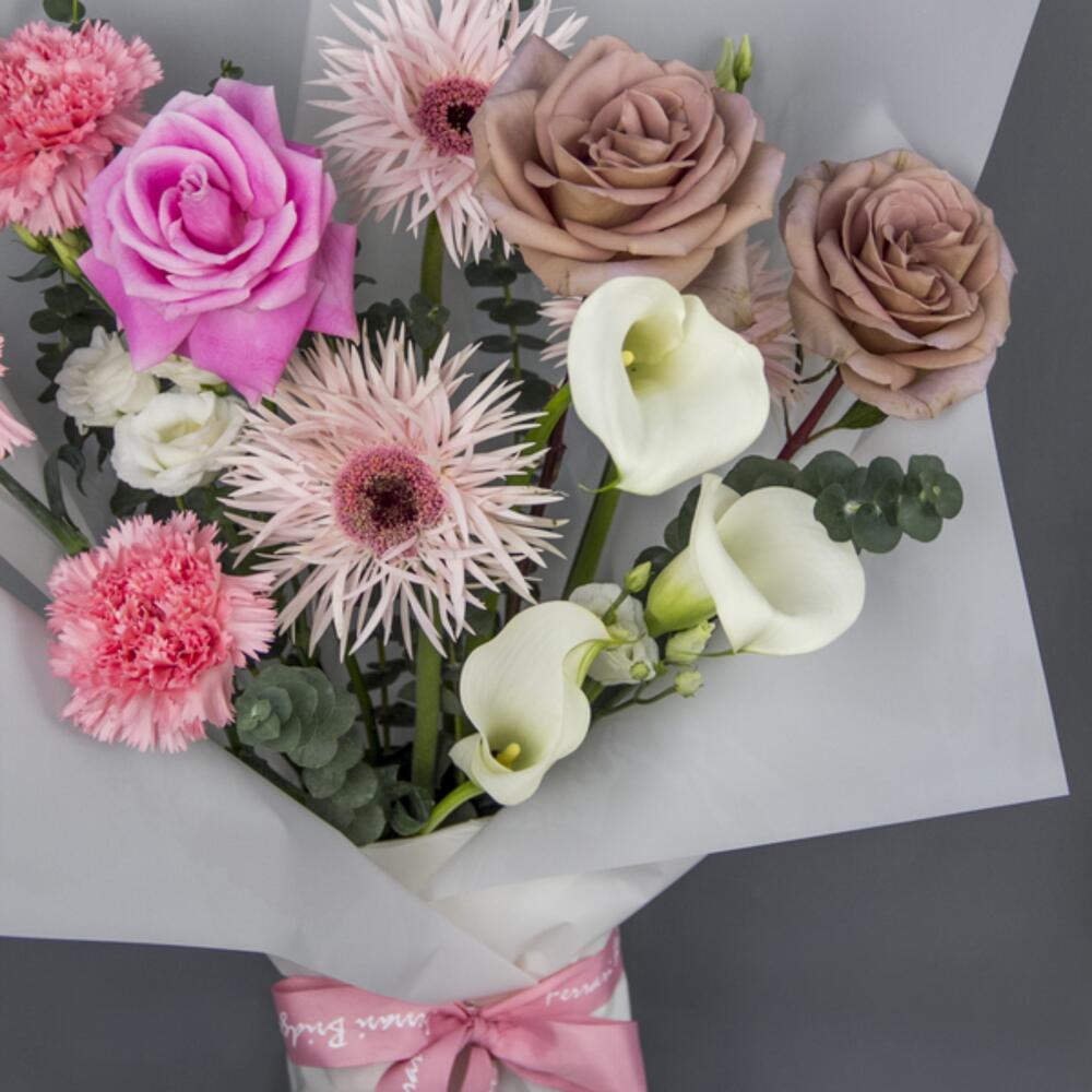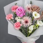 Ribbon - 1 pcs Eustoma - 1 pcs Eucalyptus - 1 pcs Gerbera - 3 pcs Wrapping - 3 pcs rose - 2 pcs carnation - 3 pcs calla lily - 3 pcs