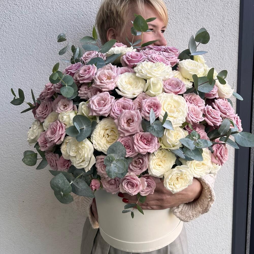 Eucalyptus - 7 pcs rosa spray white - 10 pcs rosa spray sweet violet - 29 pcs