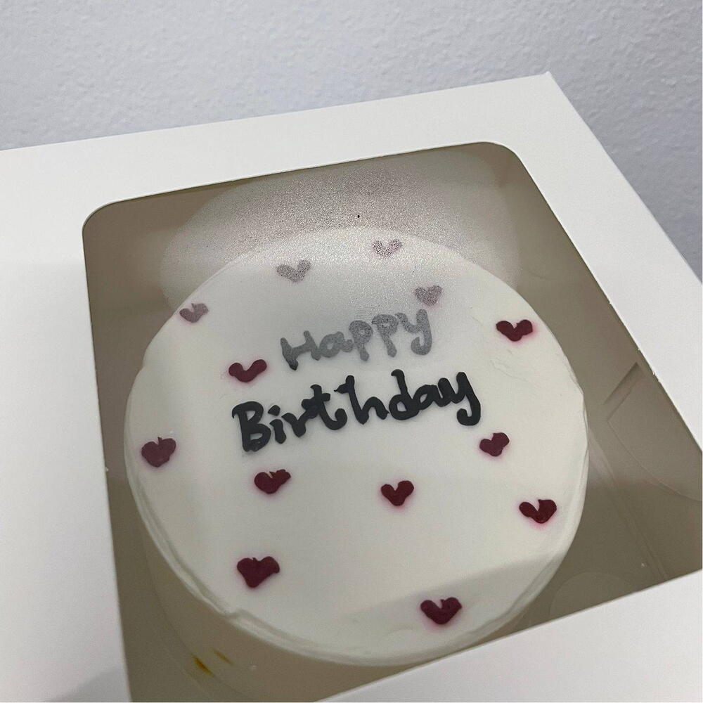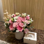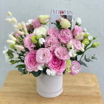 Box - 1 pcs Pink rose - 2 pcs White rose - 1 pcs lagurus - 3 pcs postcard - 1 pcs eustoma pink - 5 pcs bento cake - 1 pcs white iberis - 7 pcs