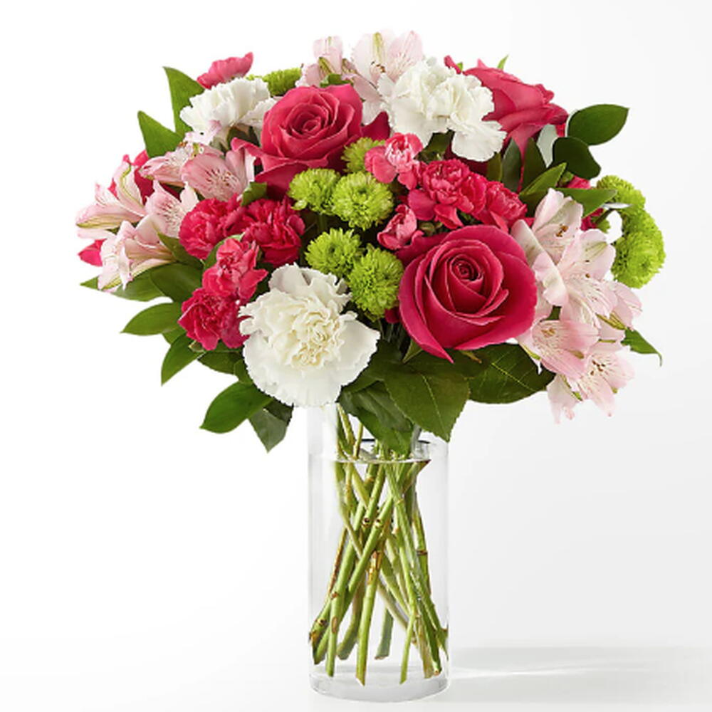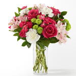 The true beauty of this bouquet is within the sweet colors of the flowers. An array of hot pink roses, pale pink alstroemeria and more are set in a glass cylinder vase, making a wonderful gift to light up the face of its recipient. Details The Deluxe Bouquet is approximately 15H x 15W. Designed by florists, ready to display. For long–lasting blooms, replace the water daily. We suggest trimming the stems every couple days.