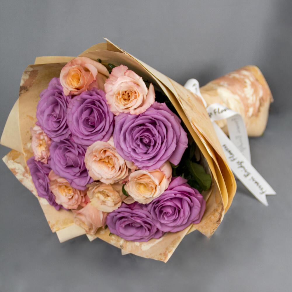 A hand bouquet of purple and peach roses