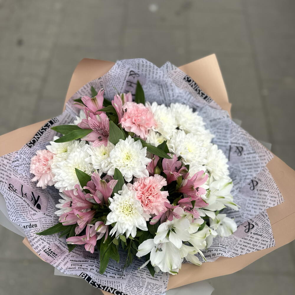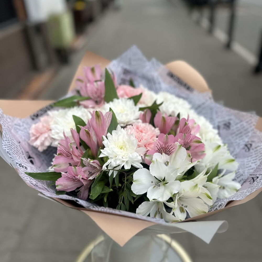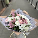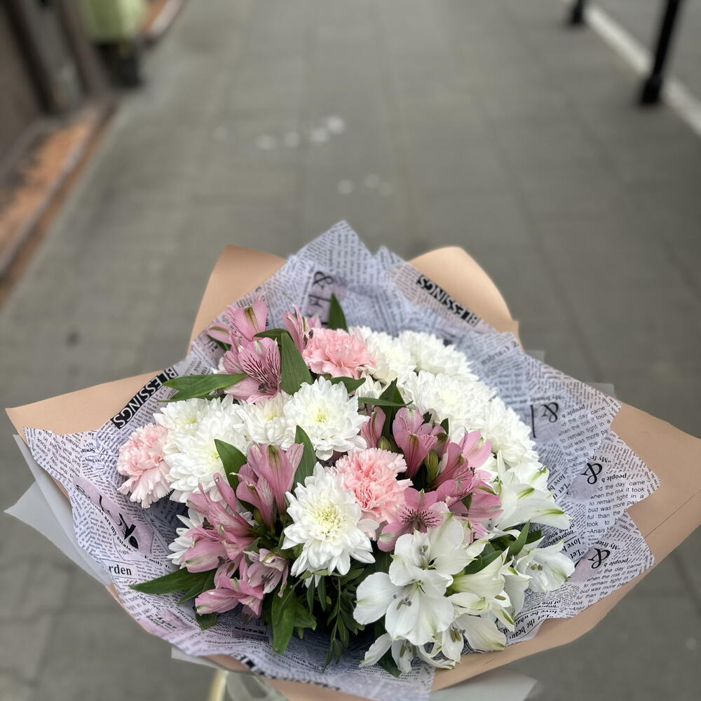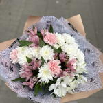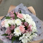 Dianthus - 3 pcs Chrysanthemum bush white - 11 pcs pistachio greens - 14 pcs alstroemeria premium mix - 7 pcs