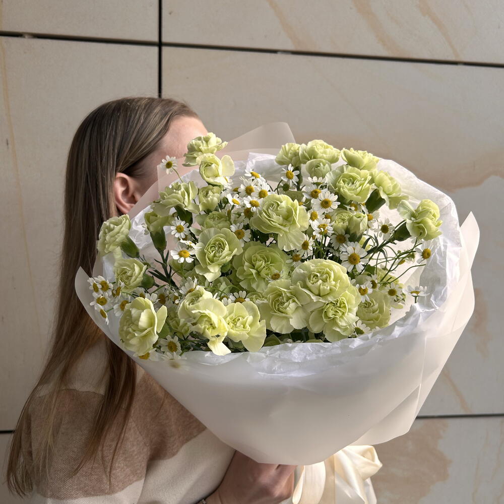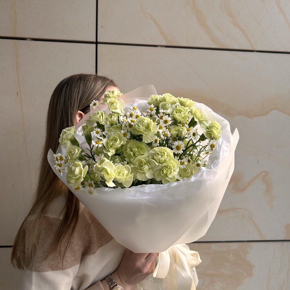 aquabox - 1 pcs chamomile - 5 pcs decorative paper - 1 pcs spray carnations - 15 pcs