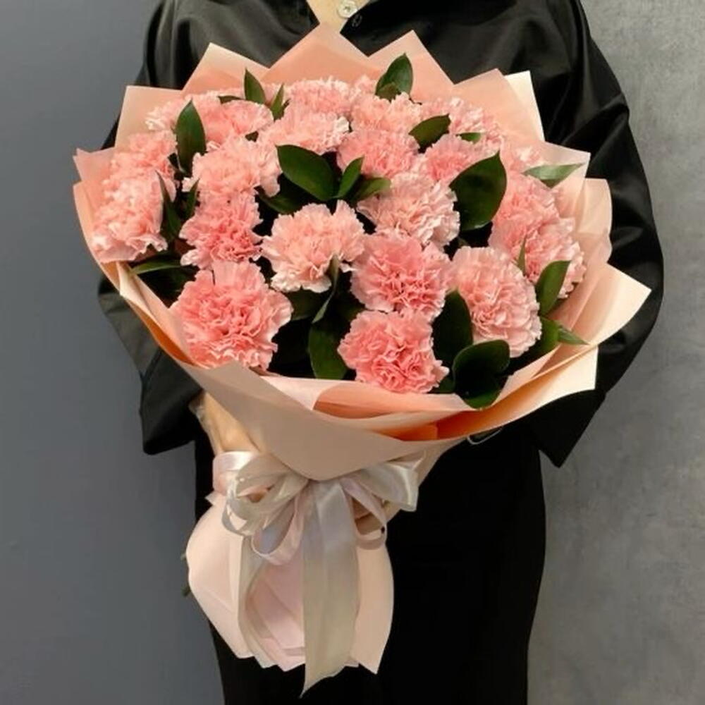 Bouquet of pink carnation and green ruscus. A beautiful gift for special occasions.