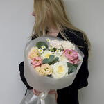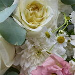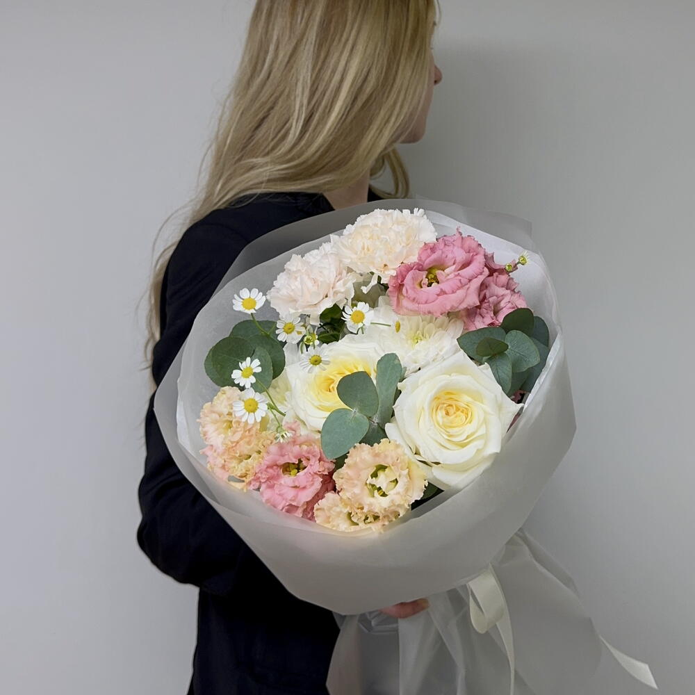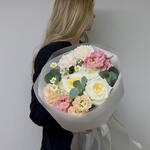 rose - 2 pcs dianthus - 3 pcs tanacetum - 1 pcs eucalipt - 2 pcs eustoma mix - 2 pcs hrizantema white - 1 pcs