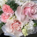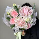 Ribbon - 1 pcs Eustoma - 2 pcs Eucalyptus - 2 pcs Ecuadorian rose - 2 pcs dianthus - 3 pcs packaging design - 2 pcs