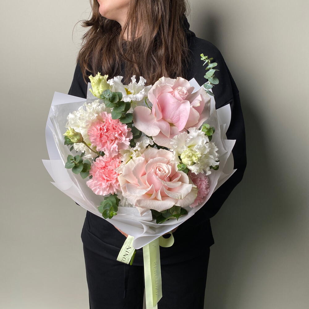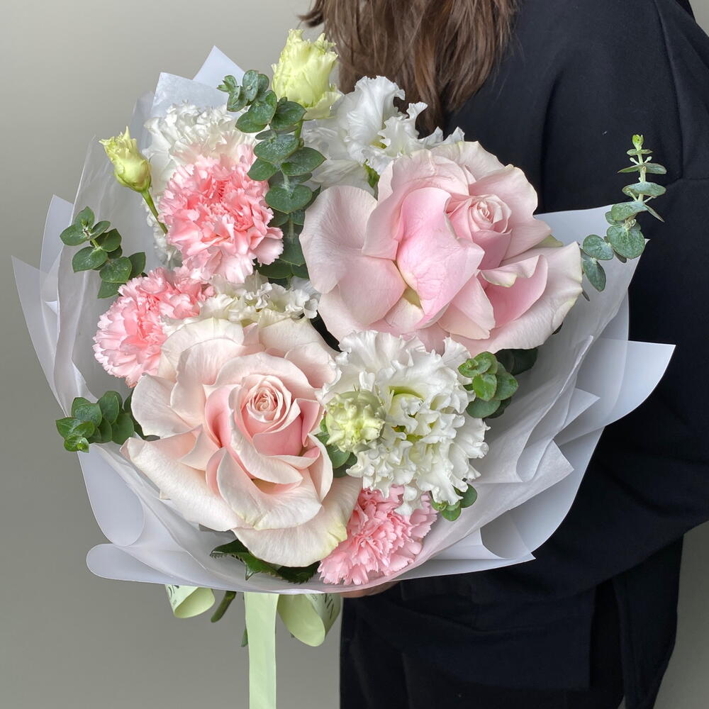 Ribbon - 1 pcs Eustoma - 2 pcs Eucalyptus - 2 pcs Ecuadorian rose - 2 pcs dianthus - 3 pcs packaging design - 2 pcs