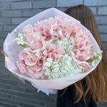 pink spray rose - 3 pcs hydrangea white - 3 pcs stocks white - 4 pcs french pink mondial roses - 9 pcs