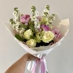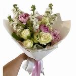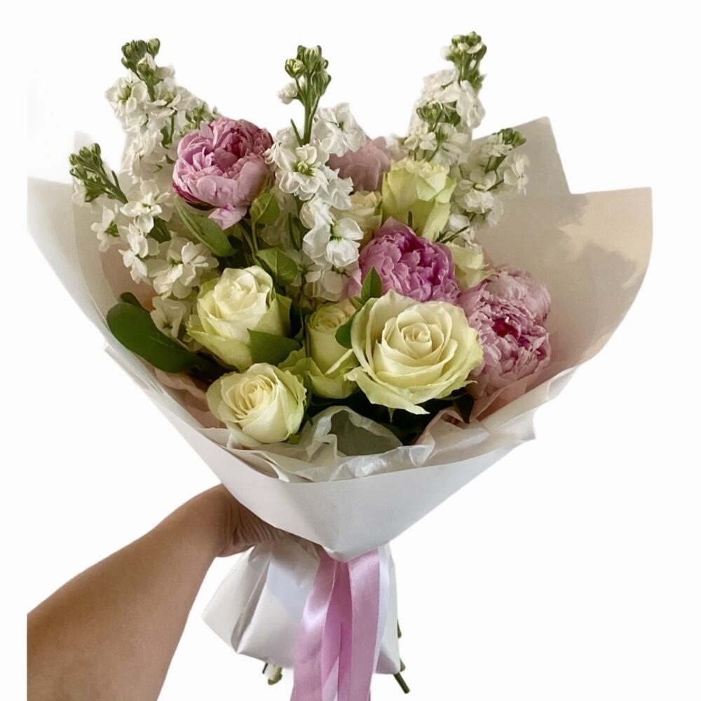 Satin ribbon - 2 pcs Peony - 5 pcs rose - 9 pcs matthiola - 7 pcs korean film - 2 pcs floral greenery - 7 pcs