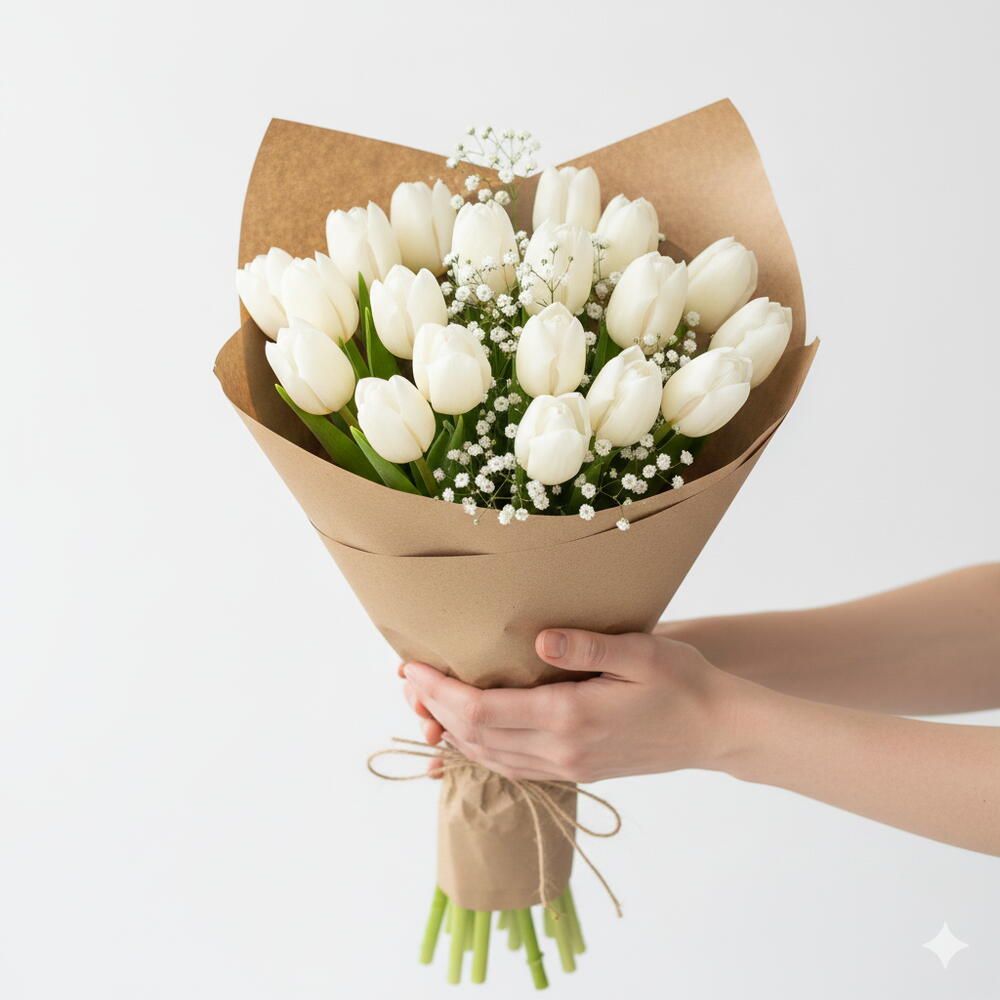 Gypsophila - 3 pcs decor - 3 pcs white tulips - 49 pcs