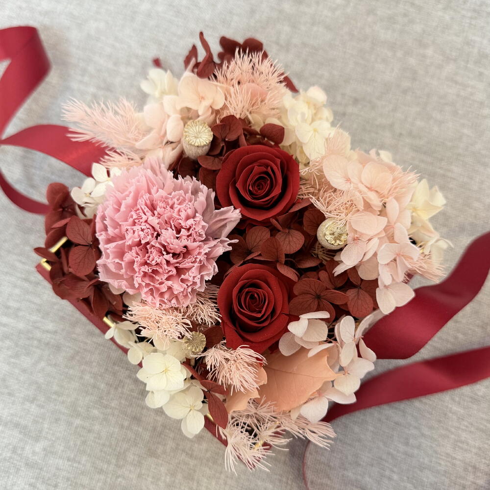 preserved rose - 2 pcs preserce carnation - 1 pcs filling flowers and foliage - 15 pcs