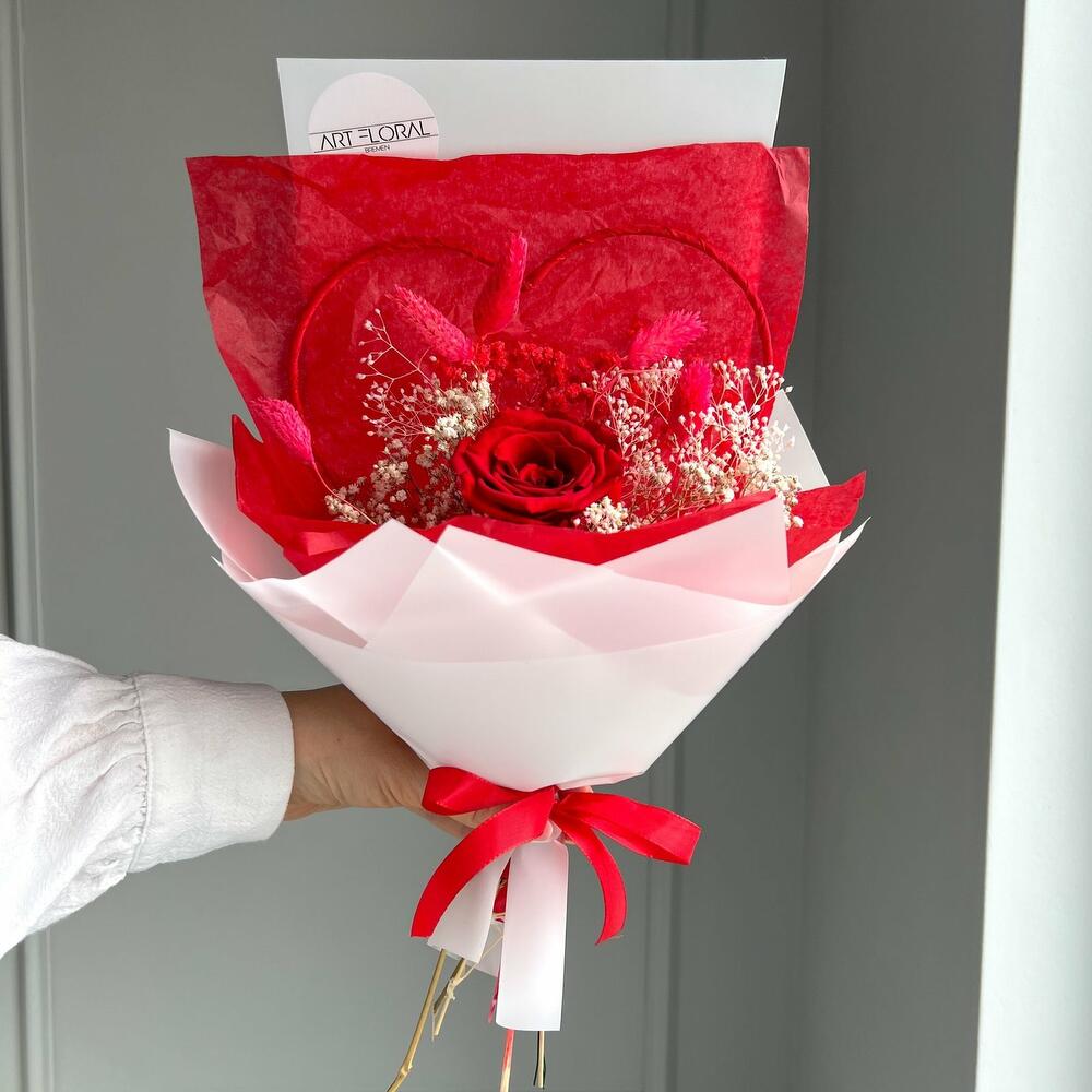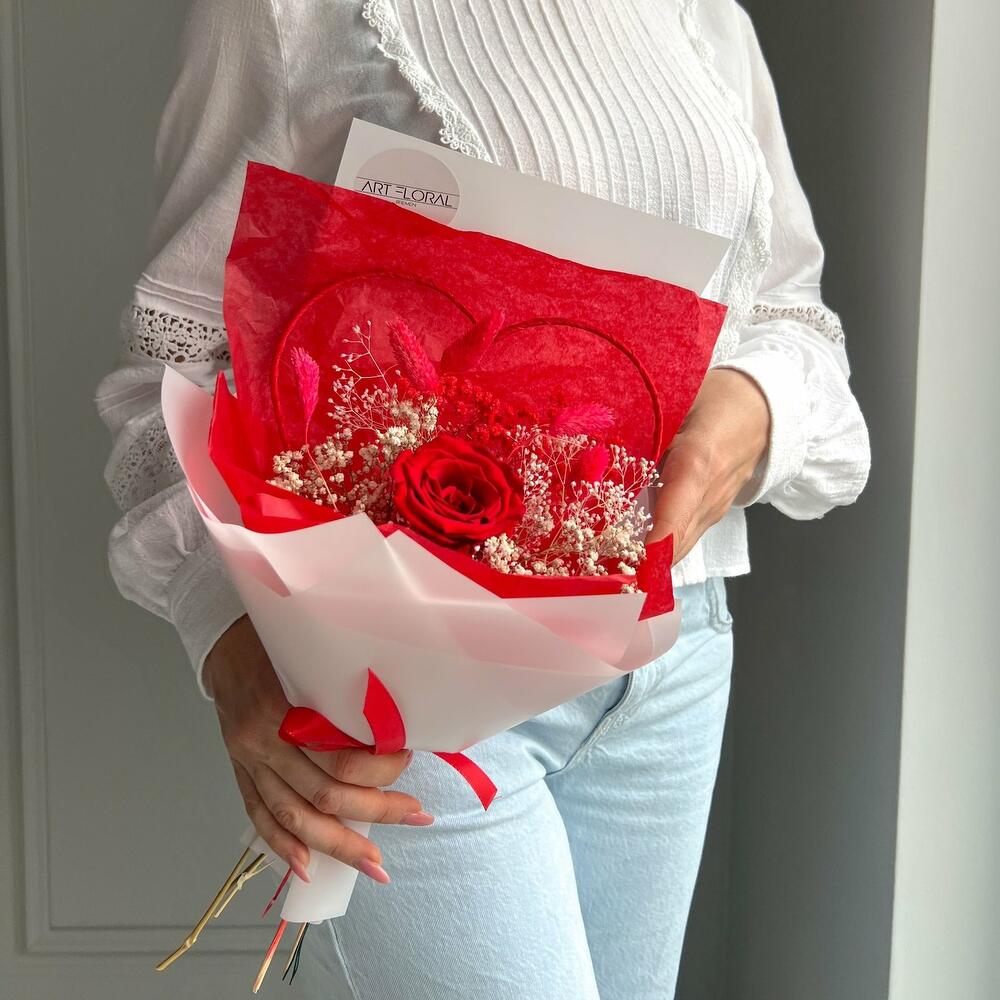 Trockenblumenstrauß Alles Liebe Der Trockenblumenstrauß „Alles Liebe“ ist eine herzliche Botschaft, die bleibt. Im Mittelpunkt steht eine tiefrote Infinity-Rose – Symbol für Liebe, Wertschätzung und emotionale Tiefe. Umgeben von zarten Trockenblumen in Beige und kräftigem Phalaris in Rot, wirkt das Arrangement warm, lebendig und gleichzeitig elegant. Ein rotes Metallherz verleiht dem Strauß zusätzlich emotionale Symbolkraft. Die Kombination aus der leuchtenden Rose, natürlichen Akzenten und weißer Verpackung macht „Alles Liebe“ zu einem vielseitigen Geschenk – ob für die Partnerin, Mama, Schwester oder eine Herzensfreundin. Die konservierte Rose bleibt über Monate hinweg wunderschön – ein langlebiger Gruß voller Gefühl. Die Erstellung jedes Arrangements erfolgt individuell mit viel Leidenschaft für unser Handwerk und somit ist auch jeder Strauß ein Einzelstück und kann etwas von Abbildungen abweichen. Es handelt sich um ein Naturprodukt, dadurch sind naturbedingte Abweichungen in der Form, Farbe oder Größe zu den Angaben möglich! Die Produktionszeit bis wir die Sendung in den Versand geben können, kann bis zu 10 Werktage betragen. Darum bitten wir um möglichst eine vorzeitige Bestellung! Um die Farbintensität des Trockenblumen-Bouquets mehrere Jahre aufrecht zu erhalten, sollten die Blumen nicht der direkten Sonneneinstrahlung ausgesetzt werden. Unsere Trockenblüten wurden einem aufwendigen Trocknungs- und Konservierungsverfahren bzw. einer Bleichung oder Färbung unterzogen , dadurch hält der getrocknete Blumenstrauß bei der richtigen Pflege eine sehr lange Zeit und strahlt eine schöne Farbintensität aus. Individuelle Anfragen nehmen wir sehr gerne entgegen, dazu einfach eines unserer vielen Kontaktmöglichkeiten nutzen.