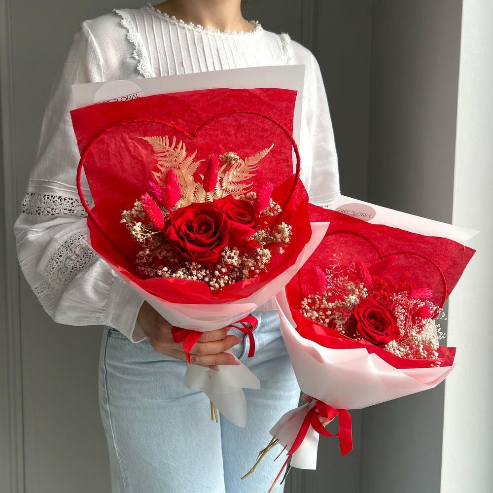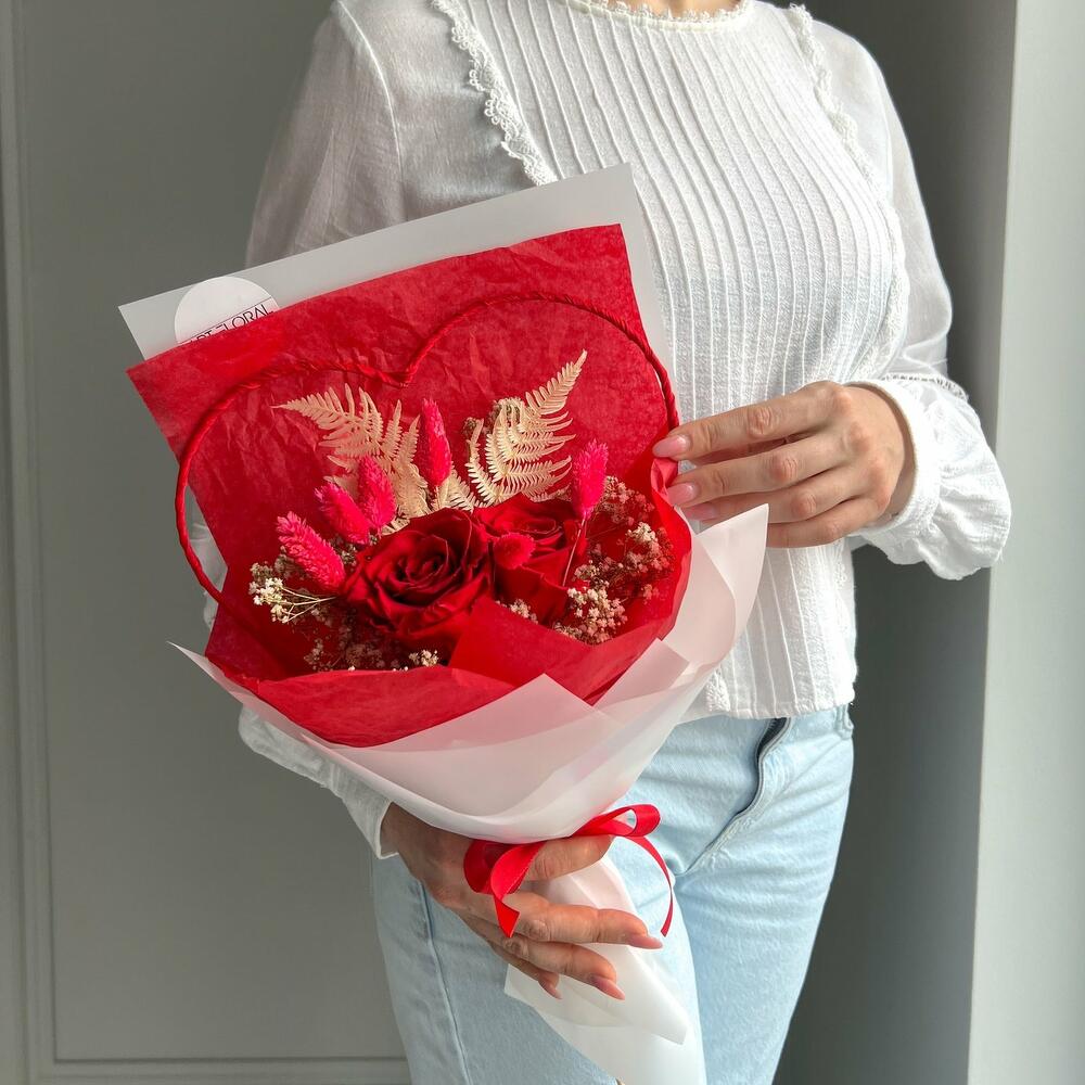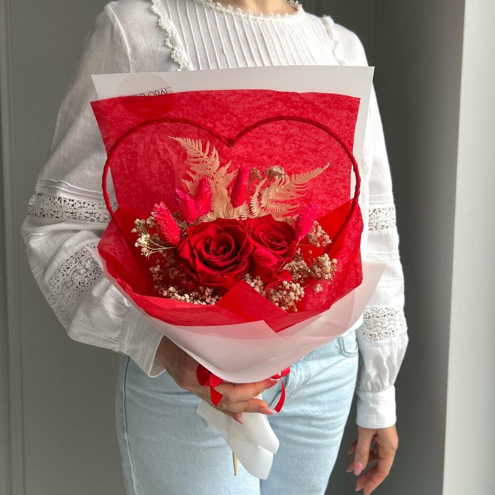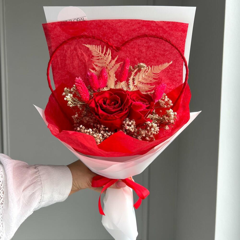 Trockenblumenstrauß Für mein Lieblingsherz Der Trockenblumenstrauß „Für mein Lieblingsherz“ ist eine liebevolle Geste für einen ganz besonderen Menschen. Zwei leuchtend rote Infinity-Rosen bilden das emotionale Zentrum dieses stilvollen Arrangements und stehen für tiefe Zuneigung, Nähe und Verbundenheit. Umrahmt von zarten Trockenblumen in Beige und rotem Phalaris sowie einem Metallherz in kräftigem Rot entsteht ein harmonisches Zusammenspiel aus Wärme, Eleganz und Leidenschaft. Die weiße Verpackung bringt die Farben wunderbar zur Geltung und macht diesen Strauß zu einem edlen Hingucker mit Herz. Ob für die Partnerin, die beste Freundin, Mama oder Schwester – „Für mein Lieblingsherz“ ist ein ausdrucksstarkes Geschenk, das bleibt. Die Erstellung jedes Arrangements erfolgt individuell mit viel Leidenschaft für unser Handwerk und somit ist auch jeder Strauß ein Einzelstück und kann etwas von Abbildungen abweichen. Es handelt sich um ein Naturprodukt, dadurch sind naturbedingte Abweichungen in der Form, Farbe oder Größe zu den Angaben möglich! Die Produktionszeit bis wir die Sendung in den Versand geben können, kann bis zu 10 Werktage betragen. Darum bitten wir um möglichst eine vorzeitige Bestellung! Um die Farbintensität des Trockenblumen-Bouquets mehrere Jahre aufrecht zu erhalten, sollten die Blumen nicht der direkten Sonneneinstrahlung ausgesetzt werden. Unsere Trockenblüten wurden einem aufwendigen Trocknungs- und Konservierungsverfahren bzw. einer Bleichung oder Färbung unterzogen , dadurch hält der getrocknete Blumenstrauß bei der richtigen Pflege eine sehr lange Zeit und strahlt eine schöne Farbintensität aus. Individuelle Anfragen nehmen wir sehr gerne entgegen, dazu einfach eines unserer vielen Kontaktmöglichkeiten nutzen.