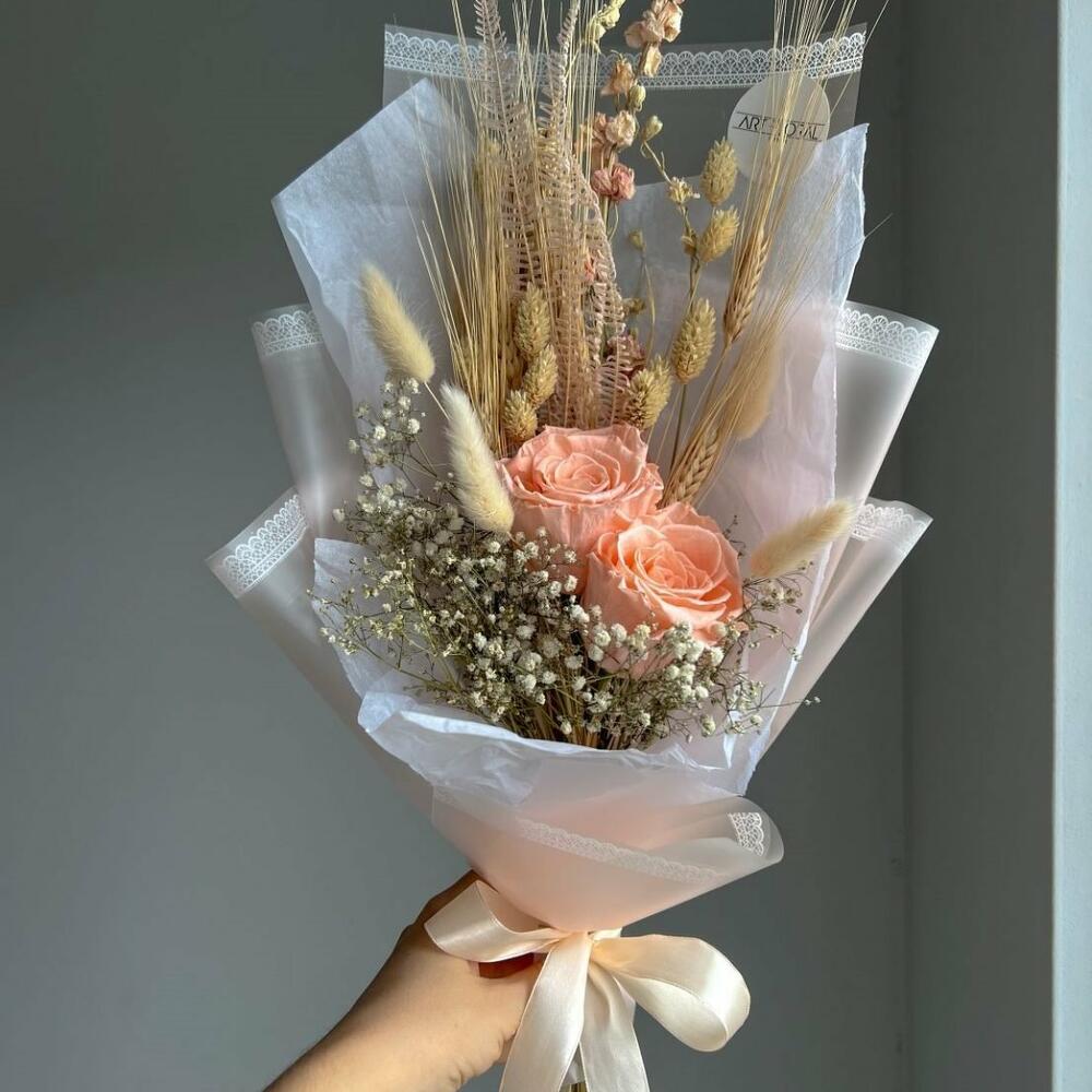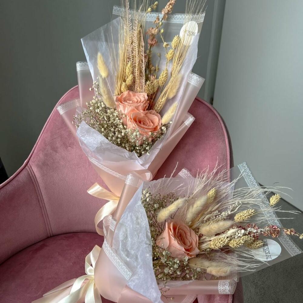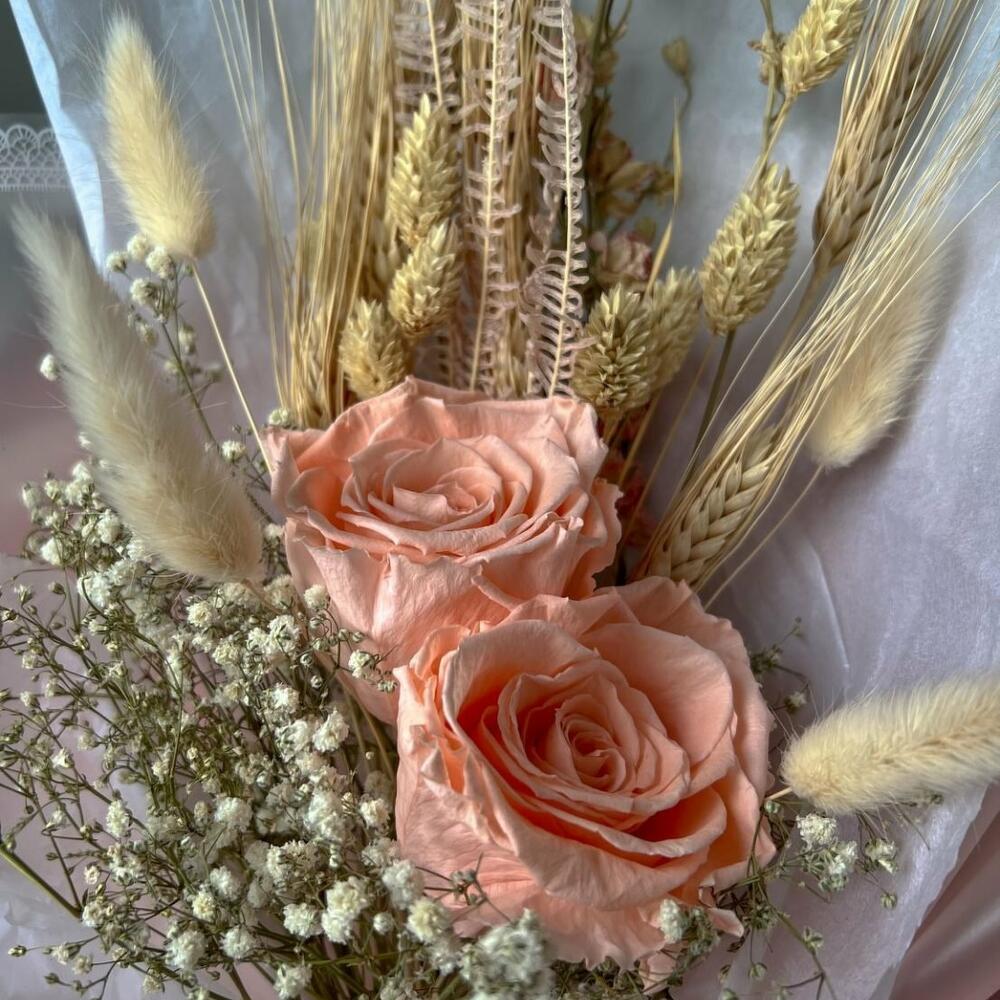 Rosen - 2 pcs Gypsophila - 5 pcs lagurus - 4 pcs delphinium - 1 pcs weizen - 3 pcs