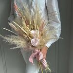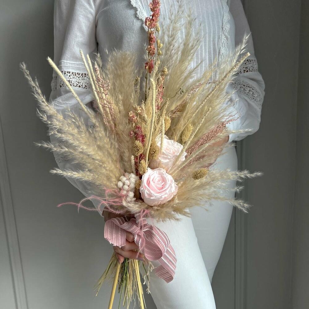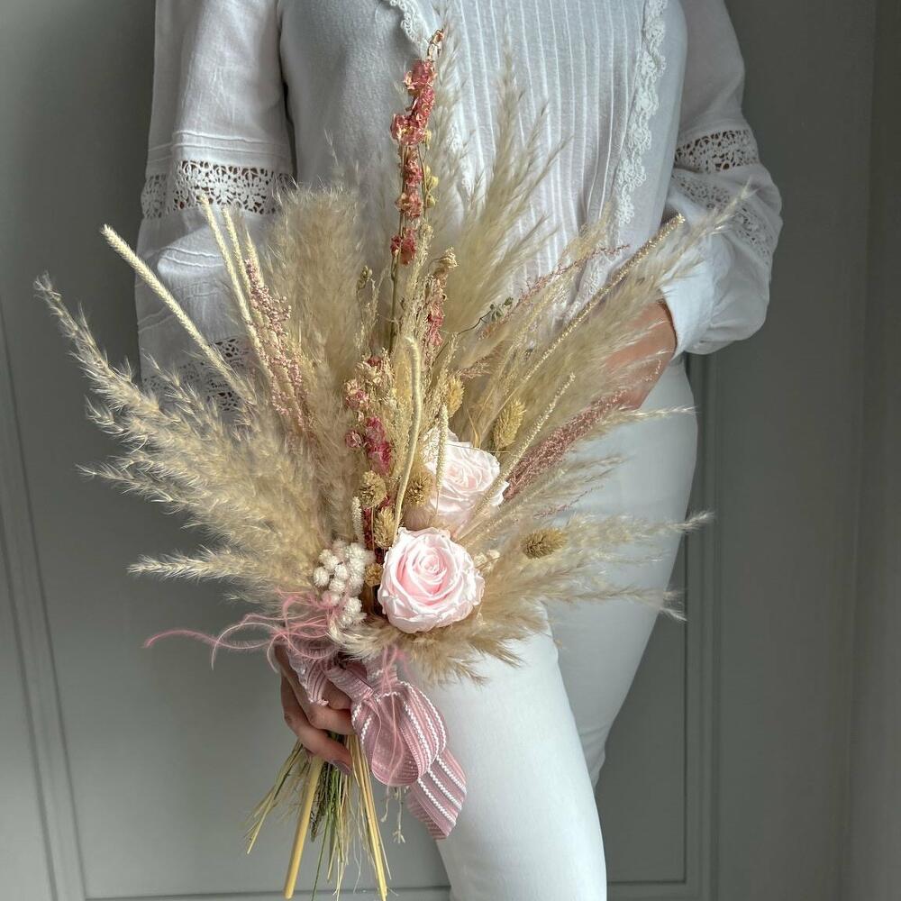 Trockenblumenstrauß Rosenhauch der Liebe. In mühevoller Handarbeit gefertigter Strauß aus Trockenblumen mit vielen verschiedenen Gräsern, wie Pampasgras, Phalaris und vielen anderen schönen trockenen Blüten. Das Highlight setzen hell rosafarbene Infinity Rosen, die den Strauß zu einem echten Blickfang werden lassen. Der Stiel des Straußes wird mit passendem Satinband umgewickelt. Gesamtlänge beträgt in etwa 58 cm und kann auf Wunsch gekürzt werden. Der Strauß besteht aus echten natürlichen, getrockneten oder konservierten Materialien und benötigt daher kein Wasser oder Pflege. Nach der Hochzeit kann das Arrangement als Erinnerung und Deko im Interieur dienen. Die Erstellung jedes Arrangements erfolgt individuell mit viel Leidenschaft für unser Handwerk und somit ist auch jeder Strauß ein Einzelstück und kann etwas von Abbildungen abweichen. Es handelt sich um ein Naturprodukt, dadurch sind naturbedingte Abweichungen in der Form, Farbe oder Größe zu den Angaben möglich! Die Produktionszeit bis wir die Sendung in den Versand geben können, kann bis zu 10 Werktage betragen. Darum bitten wir um möglichst eine vorzeitige Bestellung! Um die Farbintensität des Trockenblumen-Bouquets mehrere Jahre aufrecht zu erhalten, sollten die Blumen nicht der direkten Sonneneinstrahlung ausgesetzt werden. Unsere Trockenblüten wurden einem aufwendigen Trocknungs- und Konservierungsverfahren bzw. einer Bleichung oder Färbung unterzogen , dadurch hält der getrocknete Blumenstrauß bei der richtigen Pflege eine sehr lange Zeit und strahlt eine schöne Farbintensität aus. Individuelle Anfragen nehmen wir sehr gerne entgegen, dazu einfach eines unserer vielen Kontaktmöglichkeiten nutzen.