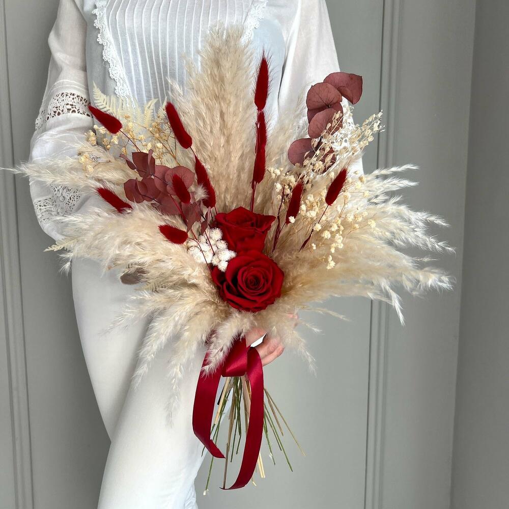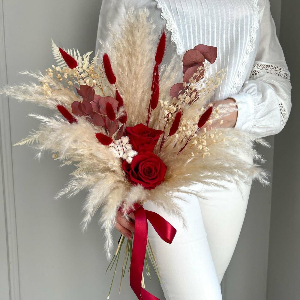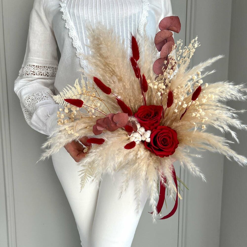 Trockenblumenstrauß Rote Rosen In mühevoller Handarbeit gefertigter Strauß aus Trockenblumen mit vielen verschiedenen Gräsern, wie Pampasgras, Lagurus und vielen anderen schönen trockenen Blüten. Das Highlight setzen rote Infinity Rosen, die den Strauß zu einem echten Blickfang werden lassen. Der Stiel des Straußes wird mit passendem Satinband umgewickelt. Gesamtlänge beträgt in etwa 57 cm und kann auf Wunsch gekürzt werden. Der Strauß besteht aus echten natürlichen, getrockneten oder konservierten Materialien und benötigt daher kein Wasser oder Pflege. Nach der Hochzeit kann das Arrangement als Erinnerung und Deko im Interieur dienen. Die Erstellung jedes Arrangements erfolgt individuell mit viel Leidenschaft für unser Handwerk und somit ist auch jeder Strauß ein Einzelstück und kann etwas von Abbildungen abweichen. Es handelt sich um ein Naturprodukt, dadurch sind naturbedingte Abweichungen in der Form, Farbe oder Größe zu den Angaben möglich! Die Produktionszeit bis wir die Sendung in den Versand geben können, kann bis zu 10 Werktage betragen. Darum bitten wir um möglichst eine vorzeitige Bestellung! Um die Farbintensität des Trockenblumen-Bouquets mehrere Jahre aufrecht zu erhalten, sollten die Blumen nicht der direkten Sonneneinstrahlung ausgesetzt werden. Unsere Trockenblüten wurden einem aufwendigen Trocknungs- und Konservierungsverfahren bzw. einer Bleichung oder Färbung unterzogen , dadurch hält der getrocknete Blumenstrauß bei der richtigen Pflege eine sehr lange Zeit und strahlt eine schöne Farbintensität aus. Individuelle Anfragen nehmen wir sehr gerne entgegen, dazu einfach eines unserer vielen Kontaktmöglichkeiten nutzen.