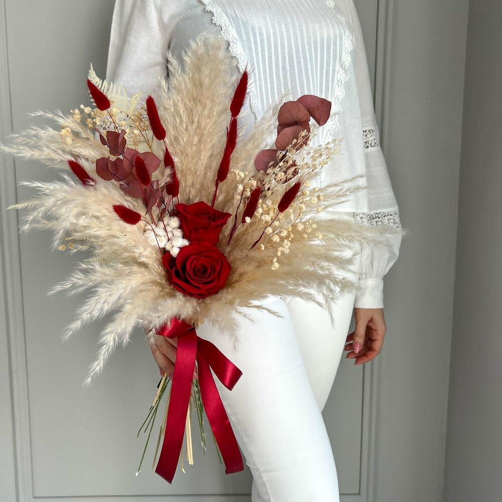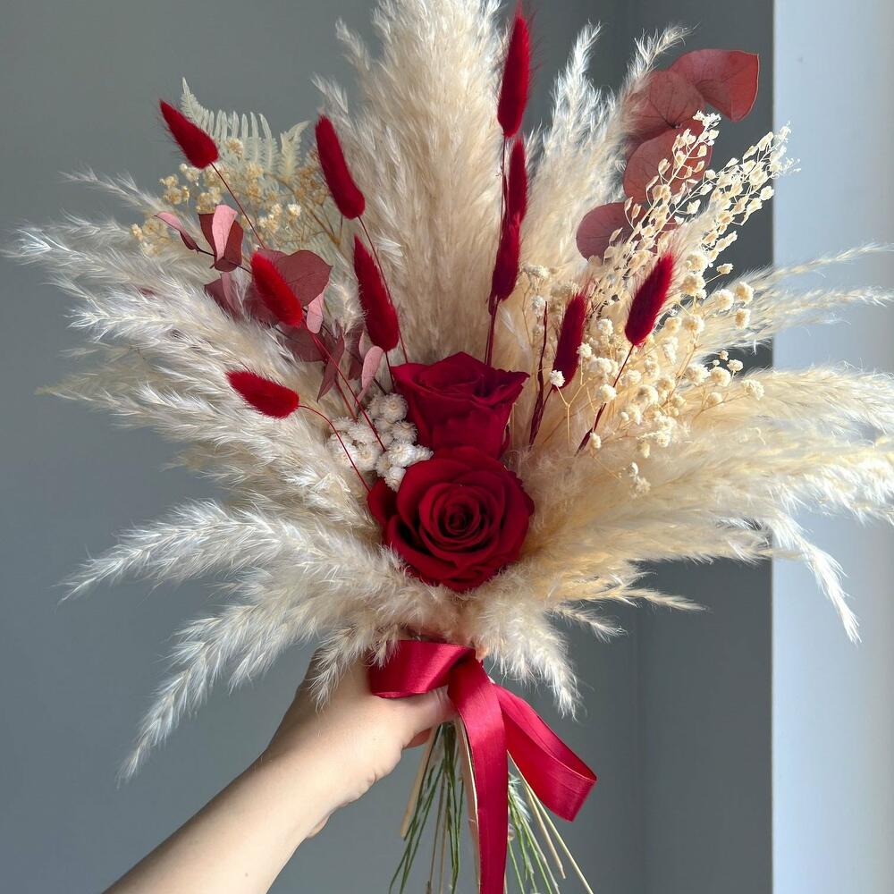 Eucalyptus - 2 pcs Rosen - 2 pcs lagurus - 7 pcs gypsophila - 2 pcs pampas - 1 pcs