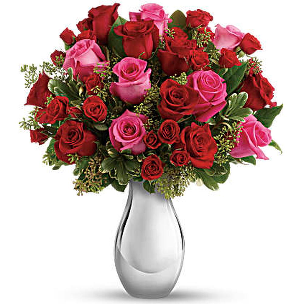 Turn up the heat on a new romance - or a lifelong love affair - with this premium rose bouquet. It features a total of fifteen of our finest red and hot pink roses and is accented with smaller red spray roses and luxuriant greens. Its all artfully arranged in our stunning Silver Reflections vase. This romantic bouquet includes large red and hot pink roses, bountiful red spray roses and greens including seeded eucalyptus and variegated pittosporum. This bouquet is delivered in our exclusive Silver Reflections vase, a metalized ceramic vase with a light pink tone. Orientation: All-Around SUBSTITUTION POLICY – Always deliver the freshest flowers! Please note the bouquet pictured reflects our original design. If the exact flowers or container in this arrangement are not available, our local florists will create a beautiful bouquet with the freshest available flowers.
